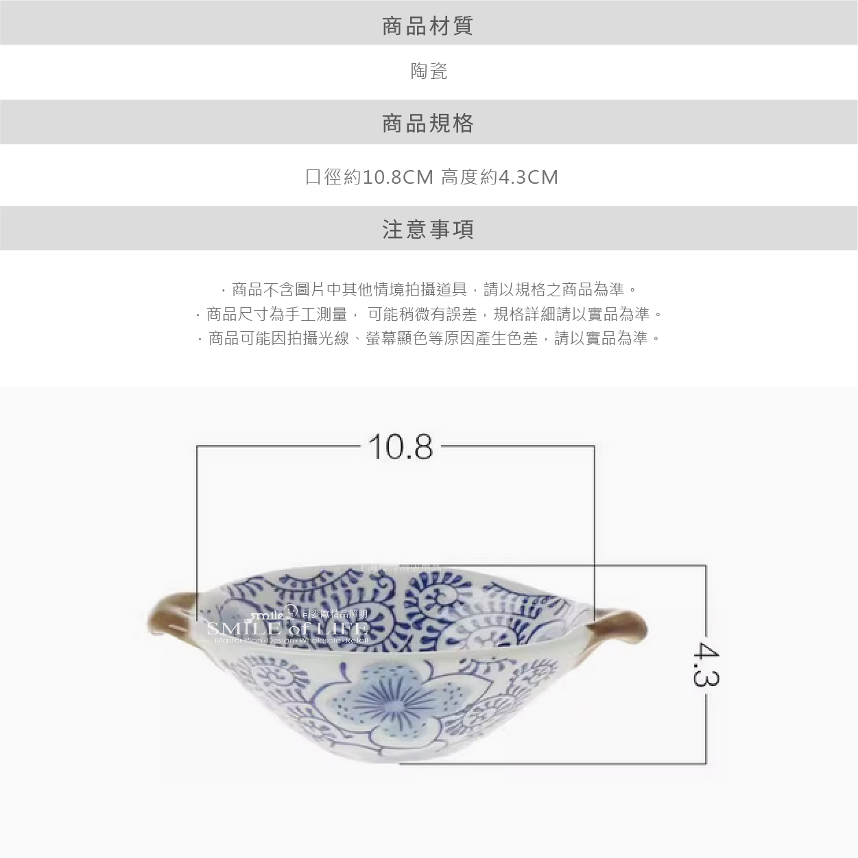 日式陶瓷雙耳釉下彩小碟 ● 雙耳設計:方便拿取,增添獨特的美感與實用性。 ● 釉下彩工藝:色彩飽滿,圖案持久,不易褪色。 ● 日式風情:花卉圖案和細膩的手工藝,體現出日式美學的簡約與精緻。 ● 高溫燒製:耐用耐熱,適合微波爐、洗碗機使用,讓您使用更安心。 - 無論是擺放精緻的前菜,還是盛裝甜美的點心, 這款小碟都能完美勝任。其獨特的設計與優雅的色彩, 將為您的每一頓餐點增添無限風采。 商品尺寸:寬10.8cm 高4.3cm