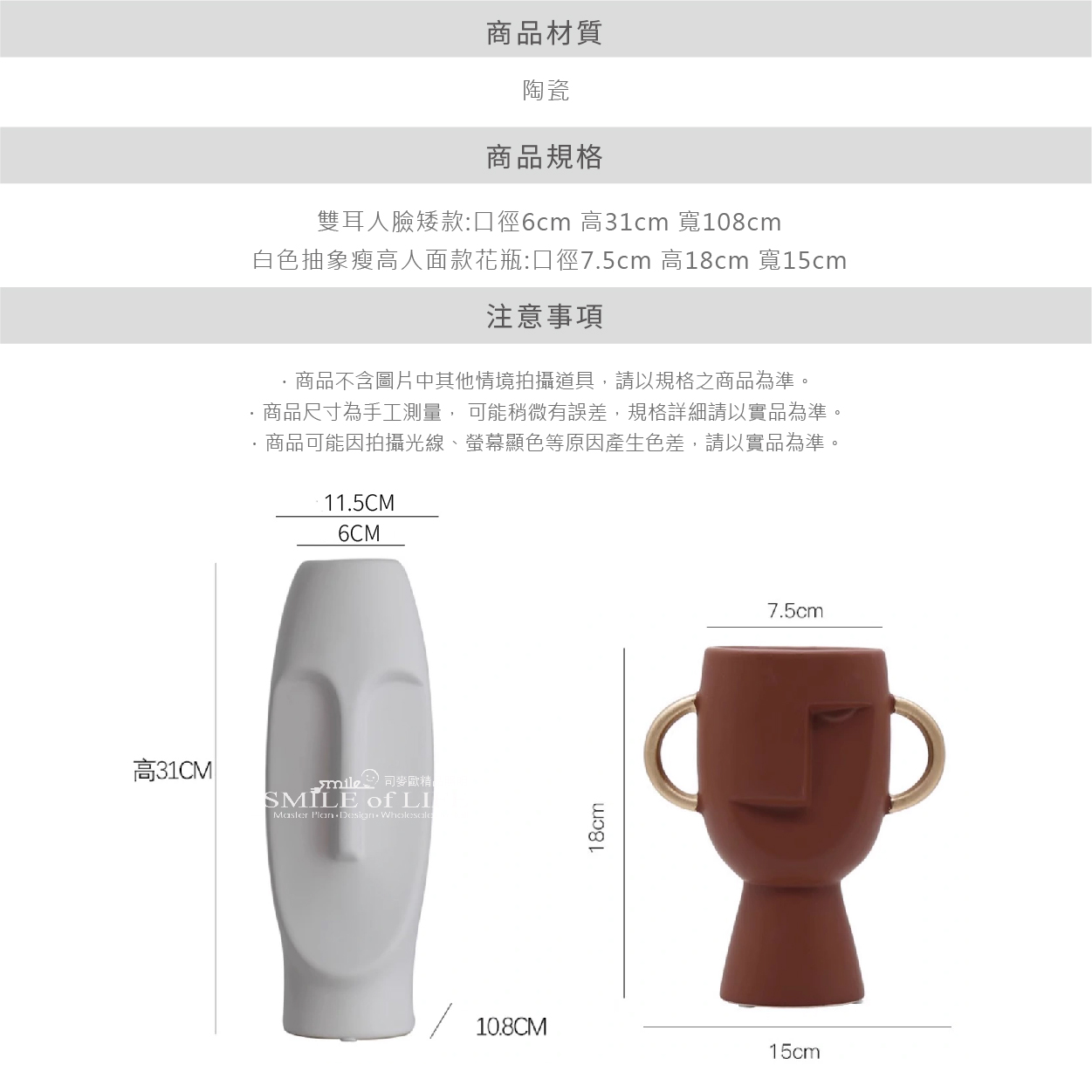 意式抽象人臉花瓶擺飾 將現代美學與實用性完美結合。 以簡約而獨特的設計理念為靈感, 彰顯出意大利設計的優雅與時尚。 - 選擇意式輕奢抽象人臉花瓶, 不僅是選擇了一件家居裝飾品, 更是選擇了一種生活態度。讓您的家居環境充滿藝術氛圍, 體現您的獨特品味和高雅情操。 / 適用場景: 適合擺放於客廳、書房、辦公室、臥室等各種空間, 無論是單獨擺放還是搭配花藝,都能為您的家居環境增添一抹藝術氣息。 產品特點: ● 高品質材質:採用高品質陶瓷製作,堅固耐用,手感細膩。 ● 獨特設計:抽象的人臉造型,給人以無限的想像空間,適合各種現代家居風格。 ● 多功能用途:不僅可以作為花瓶使用,還可作為裝飾品擺設,提升室內空間的藝術氛圍。 ● 輕奢風格:彰顯低調奢華的生活品味,是送禮自用的理想選擇。 商品尺寸:依圖示