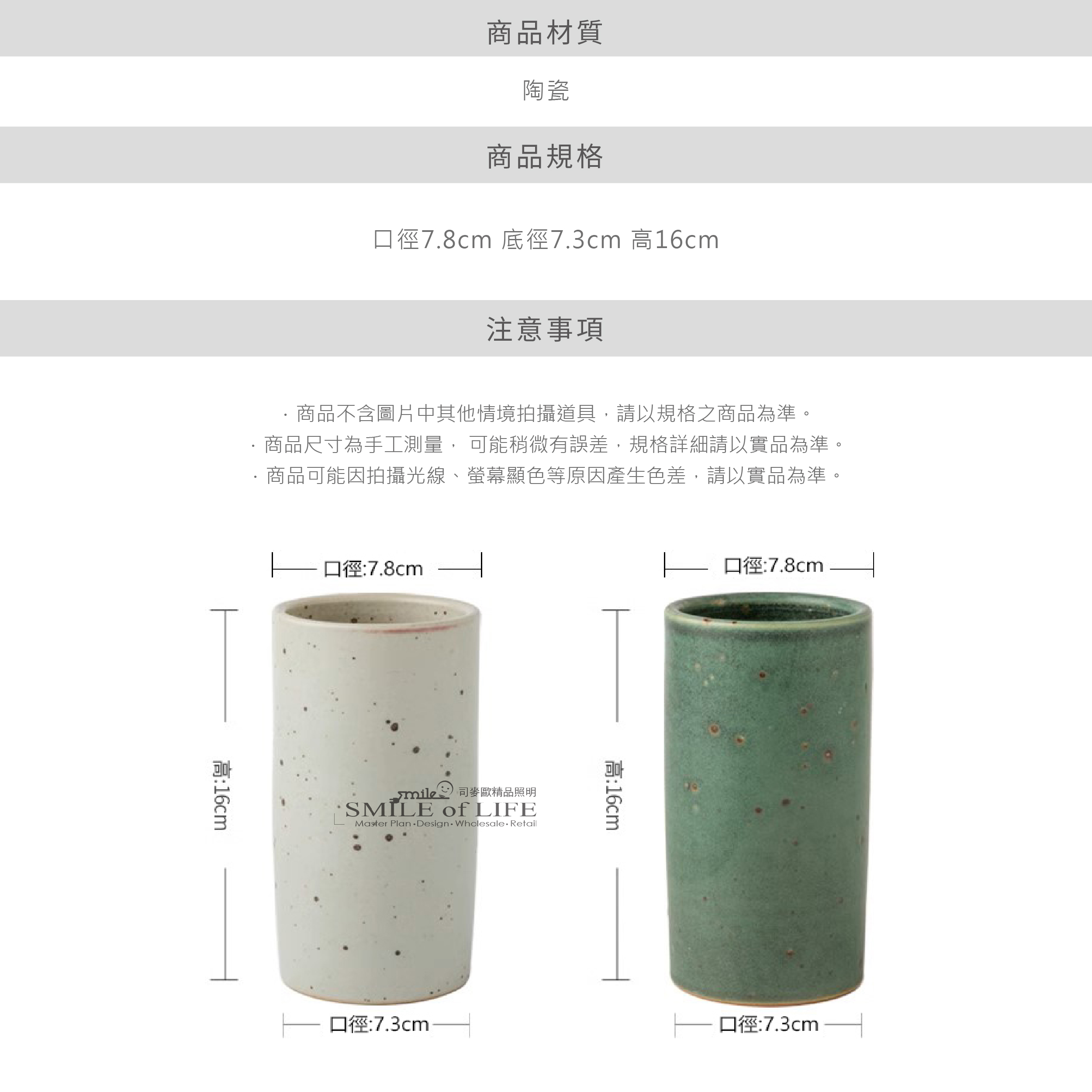 斑竹粗陶直身筒 為生活注入自然美學, 打造實用與美感兼具的多用途! 可收納餐具、廚房工具、文具,或作為花瓶。 以天然粗陶工藝結合斑竹紋理,質感沉穩而細膩 厚實陶器穩固耐用,穩定不易傾倒。 - 商品尺寸:高16cm 口徑7.8cm 底徑7.3cm 6吋:口徑15.5cm 底徑6.5cm 高5cm 7吋:口徑18cm 底徑7.8cm 高5.3cm