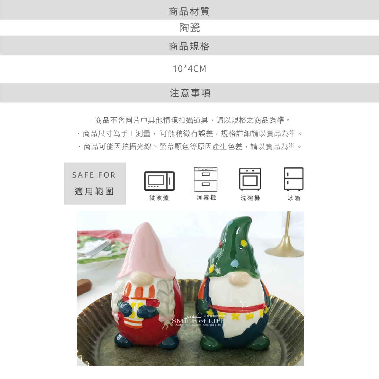 聖誕精靈陶瓷胡椒瓶|節日餐桌的俏皮點綴 🎅 為您的聖誕餐桌增添一份趣味與溫馨! 這組陶瓷胡椒瓶以聖誕精靈為靈感 栩栩如生的造型搭配鮮亮的節日色彩 將聖誕氛圍完美融入每一餐時光 - 一組兩個,實用又精美 一個裝鹽,一個裝胡椒 功能與設計兼具,為您的調味增添便利與歡樂 - 商品尺寸:10*4cm