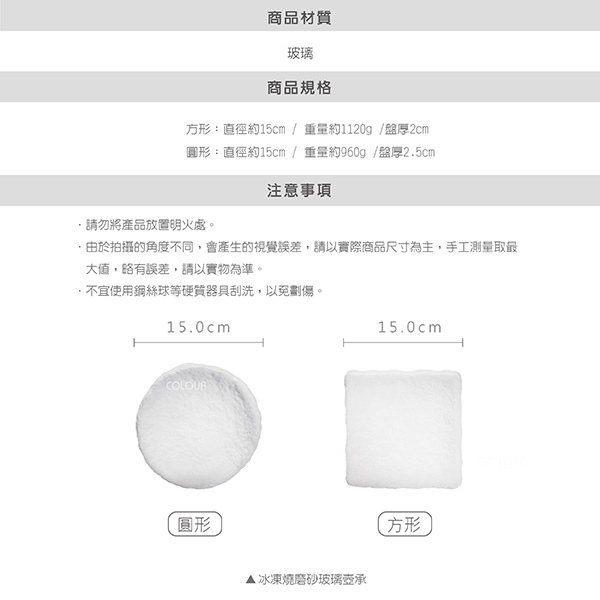 商品尺寸 方型:直徑約15cm / 重量約1120g / 盤厚2cm 圓型:直徑約15cm / 重量約960g / 盤厚2.5cm