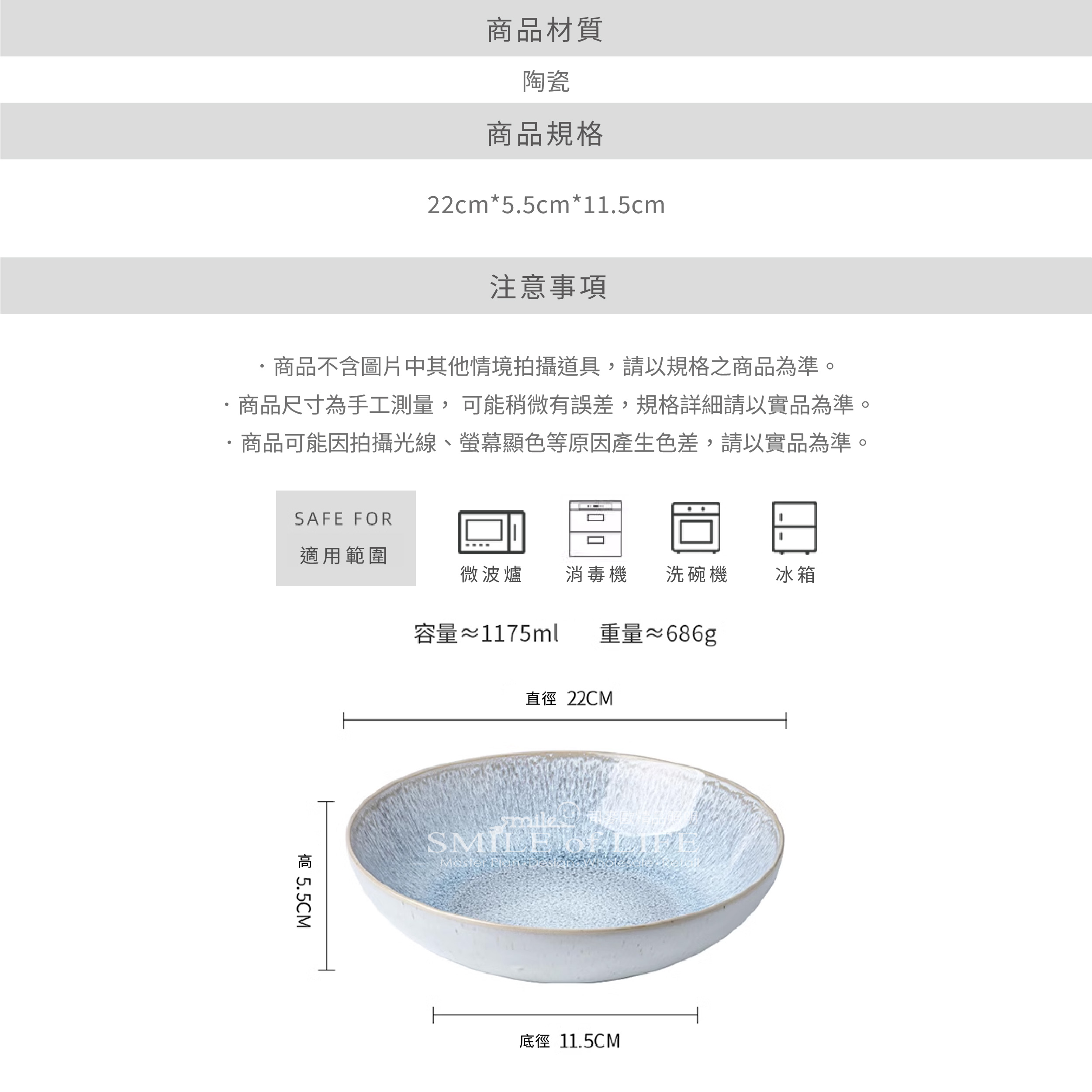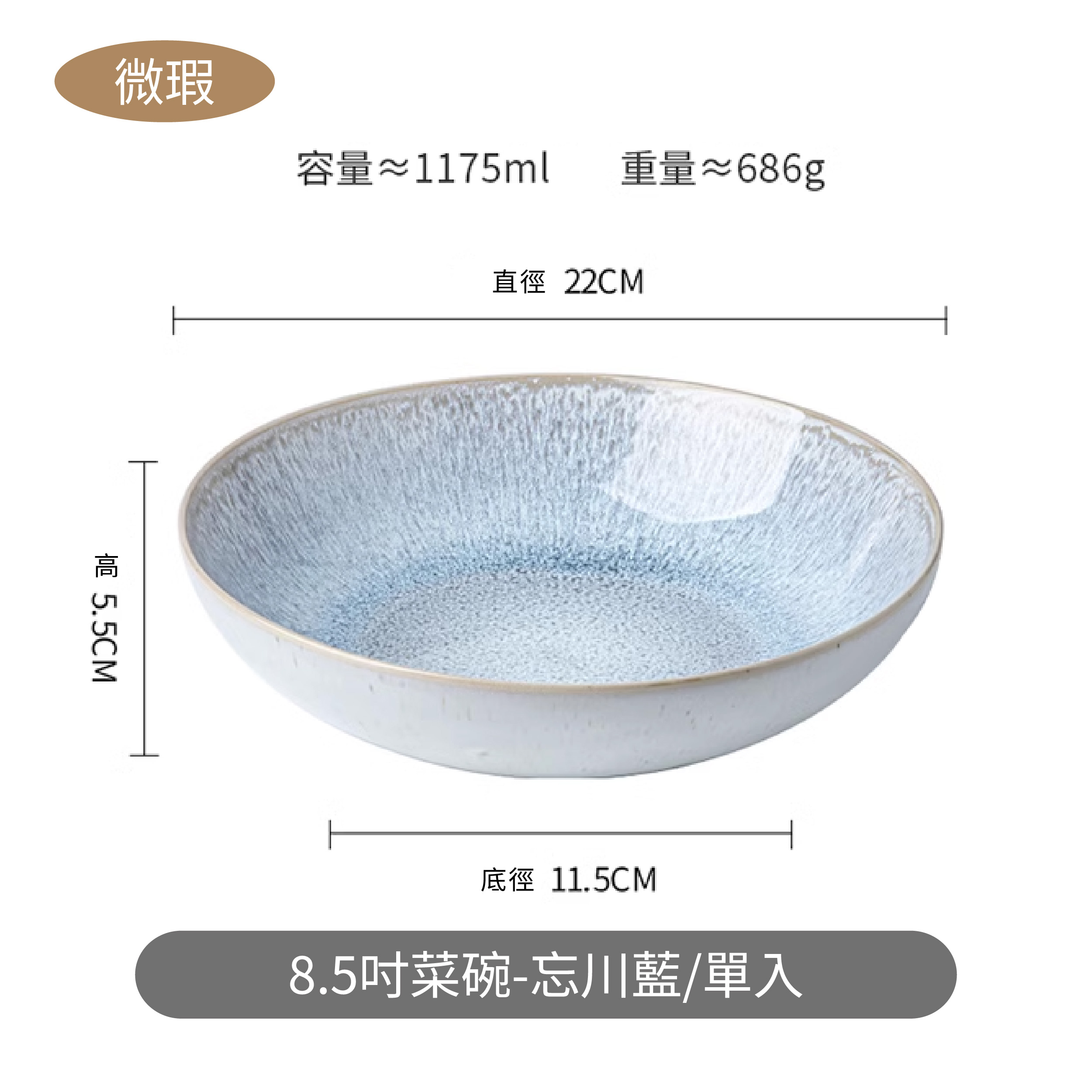 忘川藍8.5吋陶瓷碗 以簡約優雅的設計結合細膩的陶瓷質感, 寬口淺身的造型巧妙融合實用性與美感,讓擺盤更具層次感。 無論是家常燉菜、涼拌沙拉,還是精緻前菜, 皆能完美呈現,無論日常餐桌或餐廳擺盤,都能輕鬆駕馭。 讓每一餐,都能充滿儀式感✨ ✔ 8.5吋剛剛好的尺寸|適合各式料理,湯品、炒菜、沙拉皆宜 ✔ 寬口淺身設計|食物擺盤更有層次,取用方便不費力 ✔ 質感陶瓷釉面|溫潤手感,細膩光澤,低調中透出高級感 ✔ 簡約百搭風格|不挑風格,適用家用餐桌或餐廳擺盤 ✔ 耐用實用|厚實陶瓷,日常使用不易刮花,經久耐看 ⭕洗碗機 ⭕微波爐 ❌烤箱 微瑕商品須知✦ 有明顯的黑點、凹凸點、氣孔、髒印、刮痕 釉色不均等情形,不影響正常使用 下單即為同意上述問題不接受退換貨 商品尺寸:直徑22cm 底徑11.5cm 高5.5cm![]()