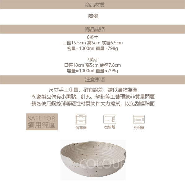 7吋:口徑18cm 底徑7.8cm 高5.3cm