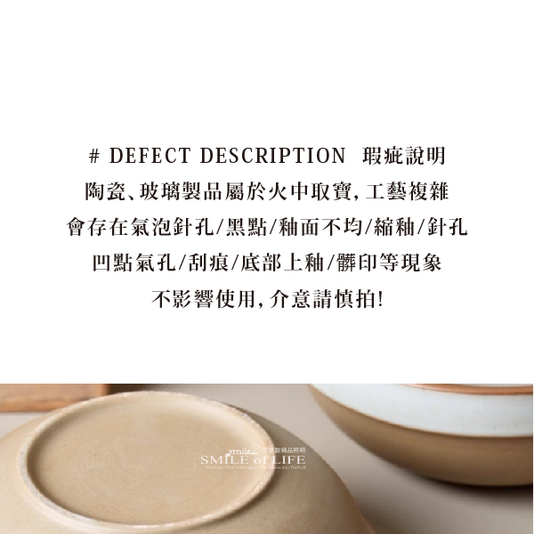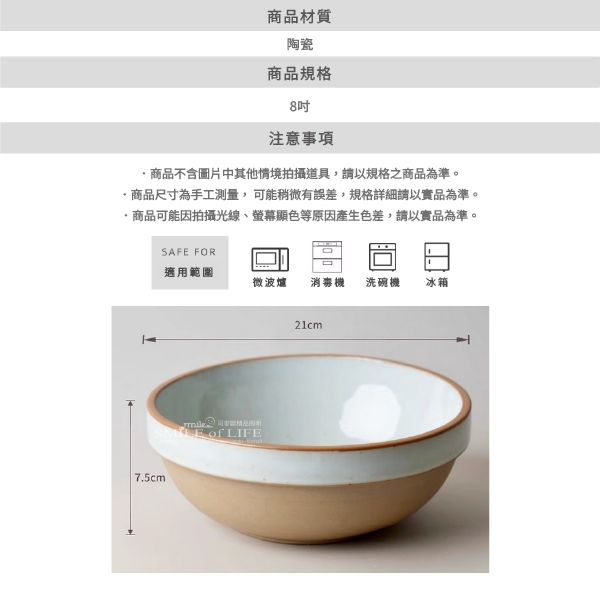 在自然肌理中,盛裝四季滋味 ——【手工粗陶窯變護邊碗 8吋🍚】 低調的窯變色澤,像一場悄然而至的晨霧 | 不喧囂,卻足夠撫慰每日三餐的心情 🌿 手工粗陶 × 不規則護邊 × 自然窯變釉彩 🍜 夠深、夠廣,湯麵、沙拉、蓋飯一次盛足 每一只都獨一無二,是器皿也是風景 | 略帶粗獷感的手感,帶來溫潤的使用體驗, 不只是碗,更是日常餐桌上靜靜發光的存在✨ ⭕洗碗機 ⭕微波爐 ❌烤箱 ✦微瑕商品須知✦ 有明顯的黑點、凹凸點、氣孔、髒印、刮痕 釉色不均、色差等情形,不影響正常使用 ・尺寸|直徑約21cm × 高約7.5cm(8吋) ・材質|粗陶・窯變釉 ・風格|北歐自然 x 復古侘寂 x 手作韻味 ✨ 適合偏愛質樸、重視餐桌質感的你,為料理添上低調卻耐看的風格輪廓。![]()