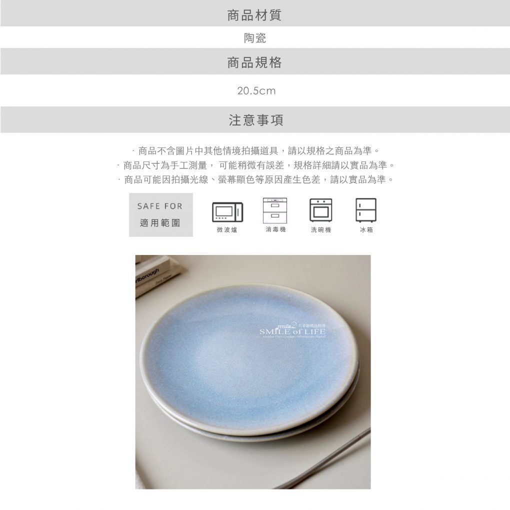 清新藍窯變餐盤 採用了獨特的窯變釉面工藝,展現出漸變的藍色調, 宛如湖水輕輕波動,清新怡人。 每一塊餐盤都獨一無二,隨著燒製過程的變化而呈現出自然的層次感, 不論是搭配日常餐點還是精緻料理,都能為餐桌增添一份高雅與自然的氛圍。 ⭕洗碗機 ⭕微波爐 ❌烤箱 ✦微瑕商品須知✦ 有明顯的黑點、凹凸點、氣孔、髒印、刮痕 釉色不均、色差等情形,不影響正常使用 商品尺寸:20.5cm![]()