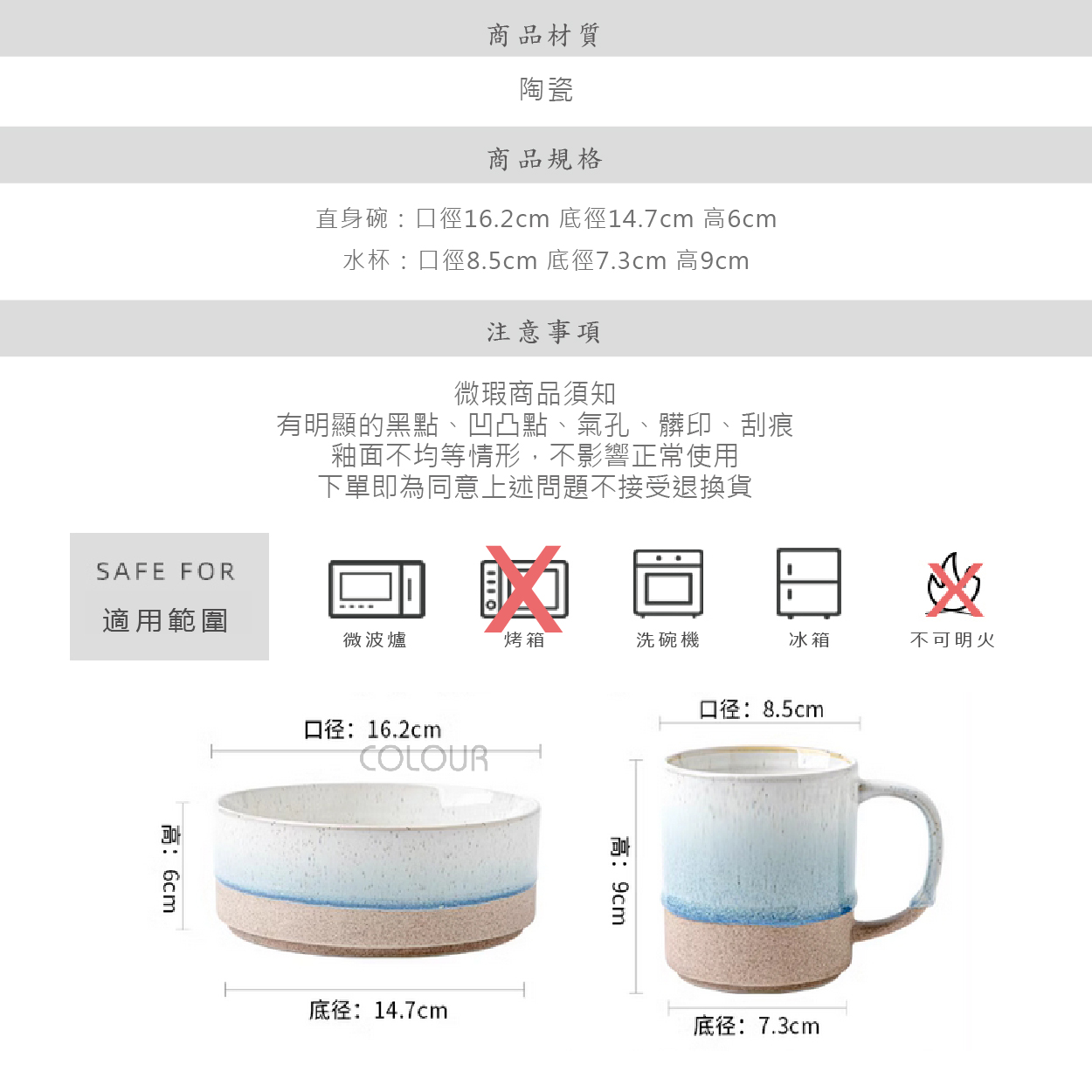 【微瑕】芝麻釉螺紋馬克杯 以芝麻釉作為表層,獨特的螺旋紋理作為裝飾 釉面細膩光滑,展現出獨特的質感 這個芝麻釉螺紋系列不僅僅是日常用品 更是一種生活方式的象徵 它承載著對品質的追求和對生活的熱愛 / ✦微瑕商品須知✦ 有明顯的黑點、凹凸點、氣孔、髒印、刮痕 釉面不均等情形,不影響正常使用 下單即為同意上述問題不接受退換貨 商品尺寸: 水杯:口徑8.5cm 底徑7.3cm 高9cm
