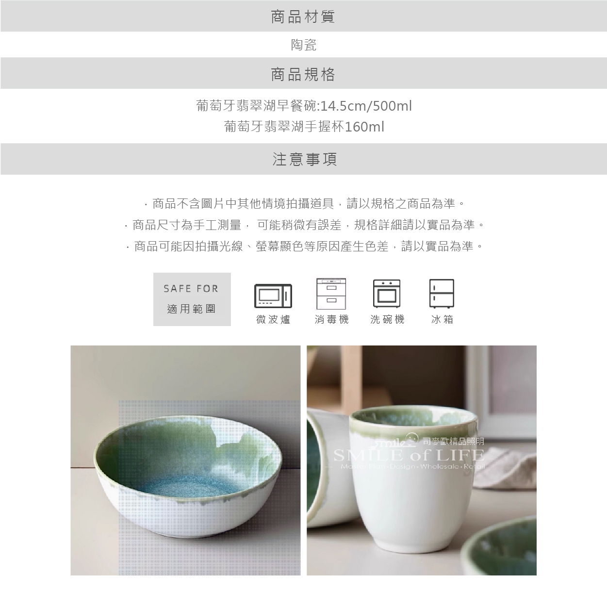 【微瑕】葡萄牙翡翠湖陶瓷餐具 🌊 翡翠湖的詩意,餐桌上的風景🌊 靈感源自葡萄牙的翡翠湖景色 這款陶瓷餐具將自然之美與藝術質感融入你的用餐時光 獨特的翡翠綠釉面,猶如湖水的微波粼粼 搭配湯碗與水杯的設計,為餐桌增添濃郁的異國情調 ⭕洗碗機 ⭕微波爐 ❌烤箱 ✦微瑕商品須知✦ 有明顯的黑點、凹凸點、氣孔、髒印、刮痕 釉色不均、色差等情形,不影響正常使用 下單即為同意上述問題不接受退換貨 商品尺寸: 早餐碗:直徑14.5cm 高5cm容量500ml 手握杯:高7cm 口徑7cm 160ml![]()