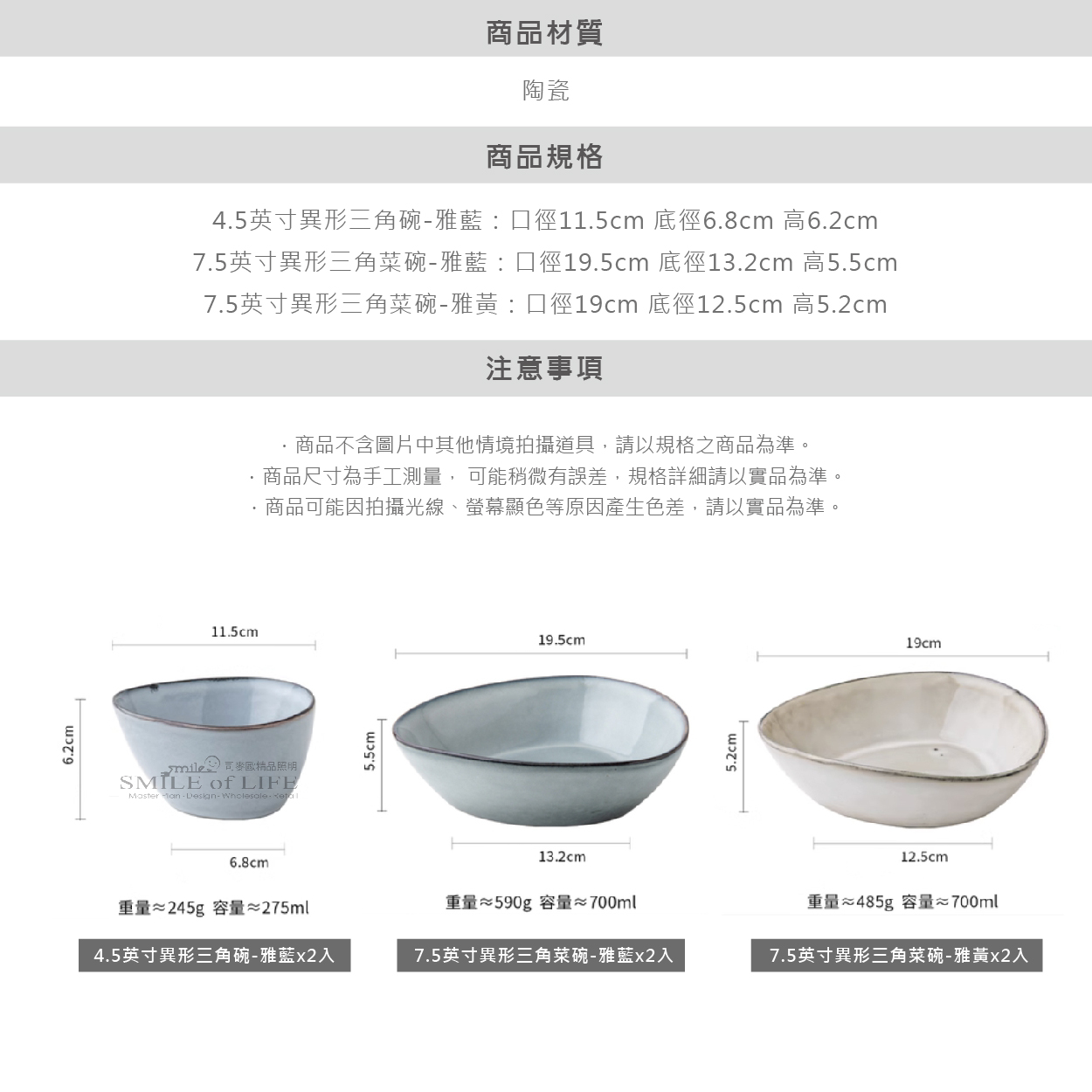 【微瑕買一送一】復古異形三角盤 復古文藝風格陶瓷碗, 好的器物,是生活的調味品。 微瑕商品價格優惠、性價比高, 通常是因為胚體、調釉、上釉、燒窯等原因, 產生變形、縮釉、黑點、針眼、色釉不均、染色等現象, 以上狀況請買家可接受再下單~ 商品規格:口徑:19cm 底徑12.5cm 高5.2cm