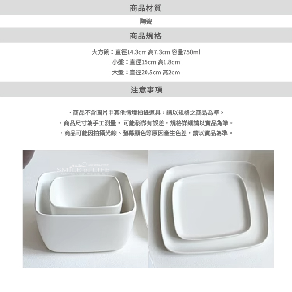 🍨 正方霧面優格小碗|簡約質感,細膩品味 🍨 方正俐落的設計,搭配霧面質感,為你的日常餐桌增添一份低調的優雅。 這款剛好適合盛裝優格、甜點、堅果或小菜,讓每一口都充滿儀式感與細緻的享受。 ✨ 特色亮點 ✨ ✅ 正方造型:打破圓形碗的單調感,增添視覺層次 ✅ 霧面質感:細膩低調,手感溫潤,散發高級感 ✅ 小巧實用:適合裝盛優格、果醬、堅果、醬料等 ✅ 百搭風格:無論北歐、日式或簡約風餐具都能輕鬆搭配 ✅ 易清潔耐用:釉面細緻,不易沾染油汙,清潔便利 用一只精緻的優格小碗,讓日常點心時光更顯品味! 🥄✨ ⭕洗碗機 ⭕微波爐 ❌烤箱 商品規格: 方形大碗-直徑14.3cm 高7.3cm 容量750ml 方形小盤-直徑15cm 高1.8cm 方形大盤-直徑20.5cm 高2cm![]()
