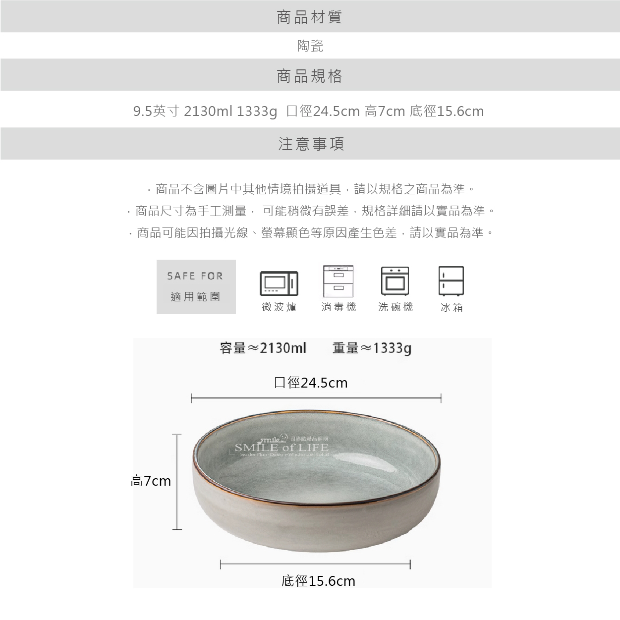 浸潤系列-9.5吋大湯碗 以細膩的淺灰色展現簡約美感 是日常生活的溫暖陪伴 直徑9.5吋的設計,容量充足 適合盛裝熱湯、麵食或豐盛的料理 讓每一餐都成為愉悅的享受 ⭕洗碗機 ⭕微波爐 ❌烤箱 ✦微瑕商品須知✦ 有明顯的黑點、凹凸點、氣孔、髒印、刮痕 釉色不均、色差等情形,不影響正常使用 下單即為同意上述問題不接受退換貨 商品尺寸:口徑24.5cm 高7cm 底徑15.6cm![]()