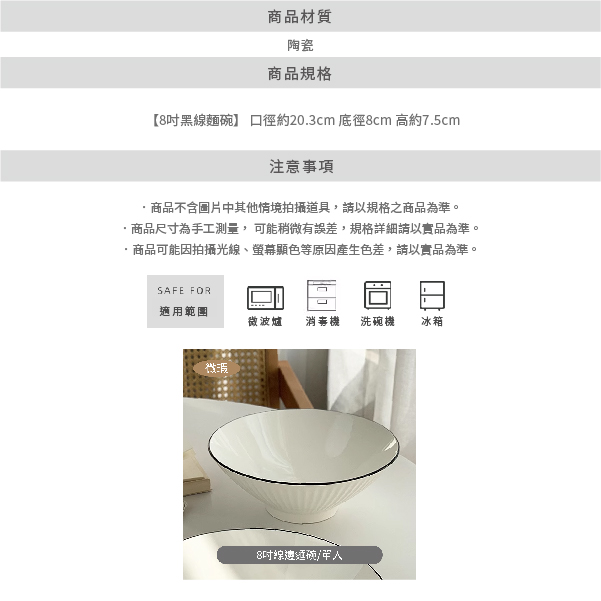純白黑邊豎紋8吋麵碗 以獨特的豎紋設計展現出細膩的工藝美感 純白的碗身搭配簡潔的黑邊勾勒 增添了一份時尚的對比層次 豎紋帶來的豐富觸感,提升了質感與視覺效果 ⭕洗碗機 ⭕微波爐 ❌烤箱 ✦微瑕商品須知✦ 有明顯的黑點、凹凸點、氣孔、髒印、刮痕 釉色不均等情形,不影響正常使用 下單即為同意上述問題不接受退換貨 商品尺寸:口徑20.3cm 底徑8cm 高7.5cm
