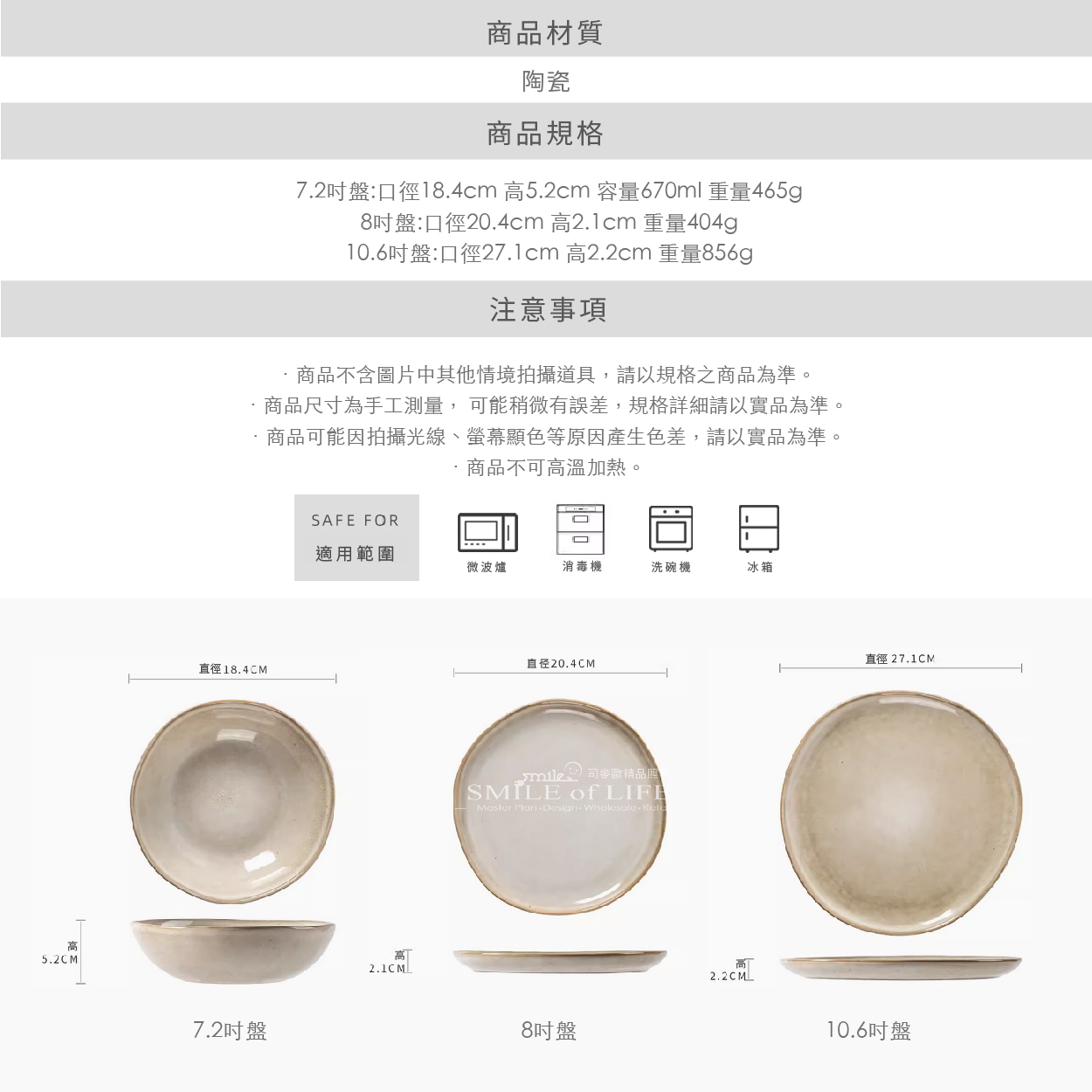 復古雲上榭系列陶瓷碗盤 在繁忙的都市生活中, 讓餐桌成為一片寧靜的綠洲... - 這系列將自然與藝術完美融合 為您的用餐時光增添無限雅趣 經典的復古風格與現代工藝相結合 無論是日常餐點還是特別宴會 都是不可或缺的點綴 ⭕洗碗機 ⭕微波爐 ❌烤箱 - ✦微瑕商品須知✦ 有明顯的黑點、凹凸點、氣孔、髒印、刮痕 釉面不均等情形,不影響正常使用 下單即為同意上述問題不接受退換貨 商品尺寸 8吋淺盤:口徑20.4cm 高2.1cm 10.6吋大盤:口徑27.1cm 高2.1cm 7.2吋敞口碗:口徑18.4cm 高5.2cm![]()