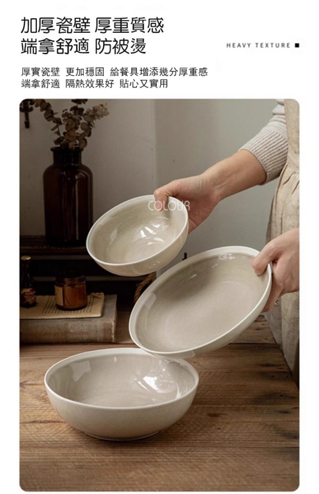 山暮系列不規則碗盤 以自然山巒與日暮黃昏的美景為靈感, 呈現出一種古樸而詩意的美感。 從傳統的中式菜餚到創意西式料理,均能完美呈現。 其獨特的外觀設計能夠提升食物的視覺效果, 使每一餐都充滿藝術感與儀式感。 更是一件藝術品,為您的用餐時光增添一絲自然的寧靜與和諧。 ⭕洗碗機 ⭕微波爐 ❌烤箱 - ✦微瑕商品須知✦ 有明顯的黑點、凹凸點、氣孔、髒印、刮痕 釉面不均等情形,不影響正常使用 下單即為同意上述問題不接受退換貨 商品尺寸: 6.5吋不規則麵碗:口徑17cm 底徑8.5cm 高6.3cm 8吋不規則平盤:口徑20.5cm 底徑13.5cm 高1.5cm 8吋圓盤:口徑21.8cm 底徑13cm 高2cm 8.5吋不規則淺盤:口徑22cm 底徑15cm 高4.2cm 14吋大魚盤:口徑35cm 底徑26.5cm 高3cm 13吋不規則大果盤:口徑33cm 底徑22cm 高6cm![]()