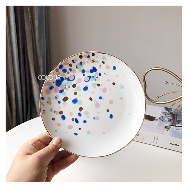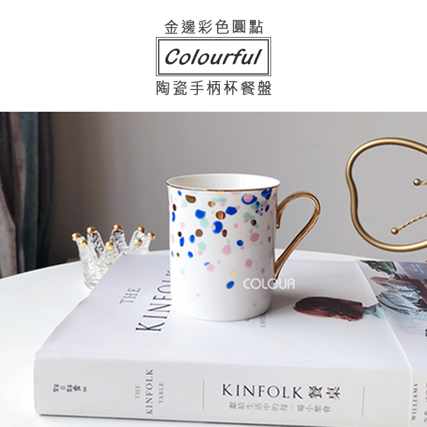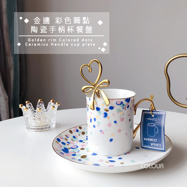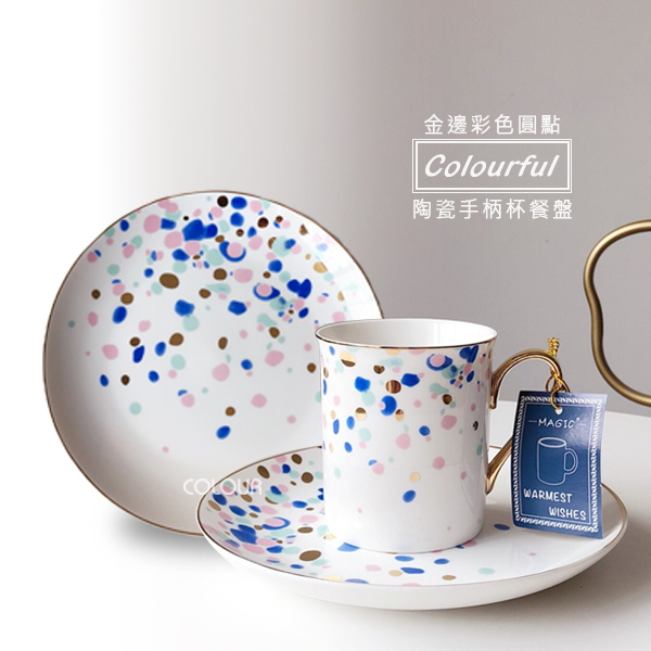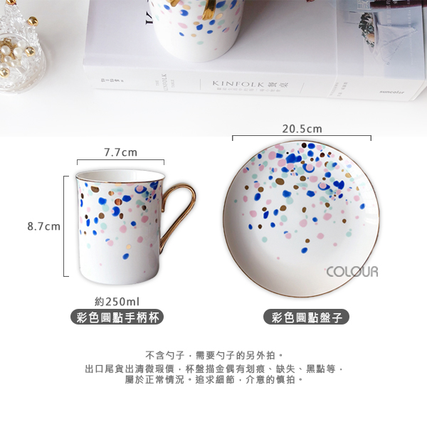 【瑕疵】彩色圓點陶瓷杯盤組 五彩潑墨,彩色圓點綴的恰到好處 杯盤邊緣描金,高雅又有格調 讓餐點多了幾分味道 不含勺子,需要勺子的另外買。 出口尾貨出清微瑕價,微污、刮痕、金編微掉漆、黑點等, 屬於正常情況,高標者請三思 【商品尺寸】 盤子/直徑約20.5cm 杯子/口徑約7.7cm,高度約8.7cm,容量約250ml