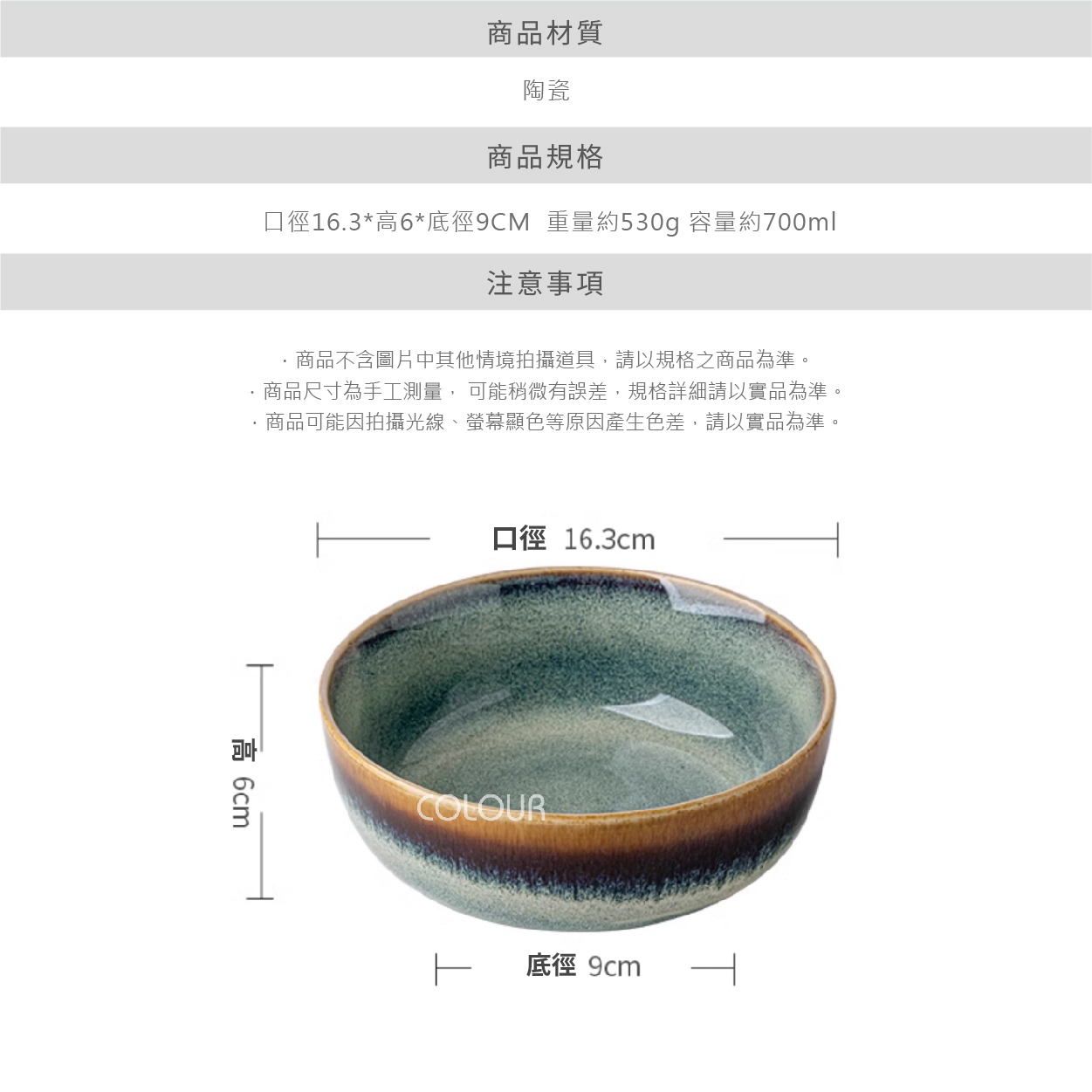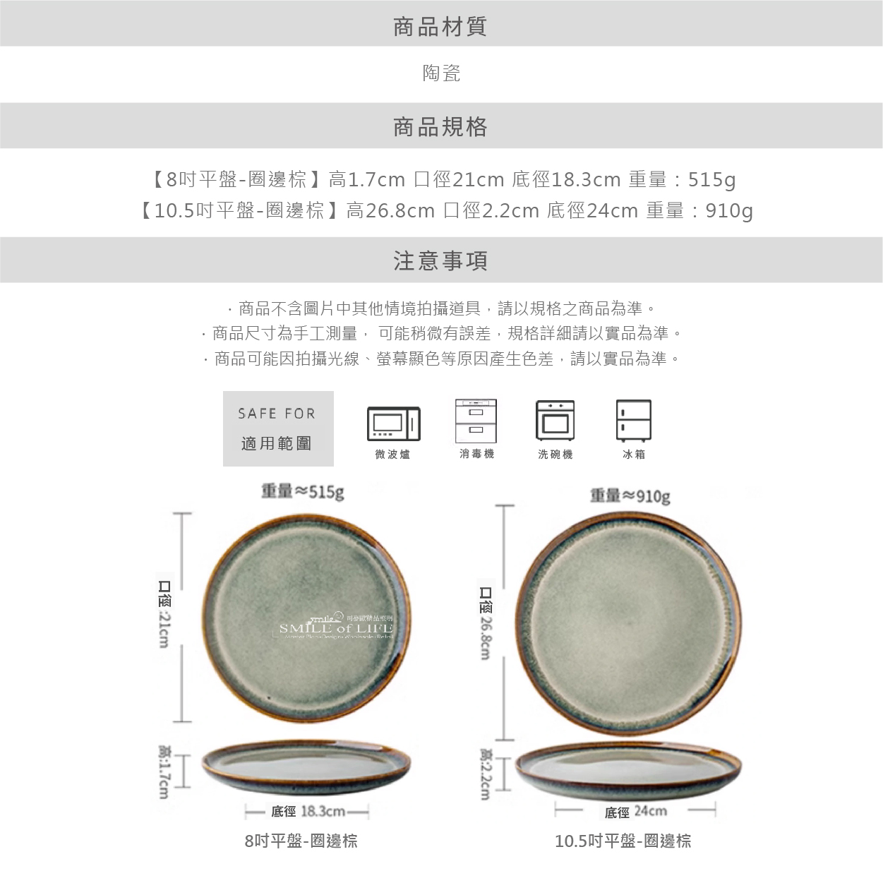 【買一送一】復古窯變圈邊棕系列餐盤 顏值生活 讓生活充滿儀式感 給您的生活一點美好 抽離城市的繁忙 - •復古質感 •簡約器型 •多變釉色 用作於麵碗 菜碗 沙拉碗都合適 光滑細膩的健康釉面 好清洗不退色 ⭕洗碗機 ⭕微波爐 ❌烤箱 - ✦微瑕商品須知✦ 有明顯的黑點、凹凸點、氣孔、髒印、刮痕 釉面不均等情形,不影響正常使用 下單即為同意上述問題不接受退換貨 商品尺寸 6.5吋麵碗:口徑16.3cm 高6cm 底徑9cm 8吋平盤:口徑21cm 高1.7cm 底徑18.3cm 10.5吋平盤:口徑26.8cm 高2.2cm 底徑24cm