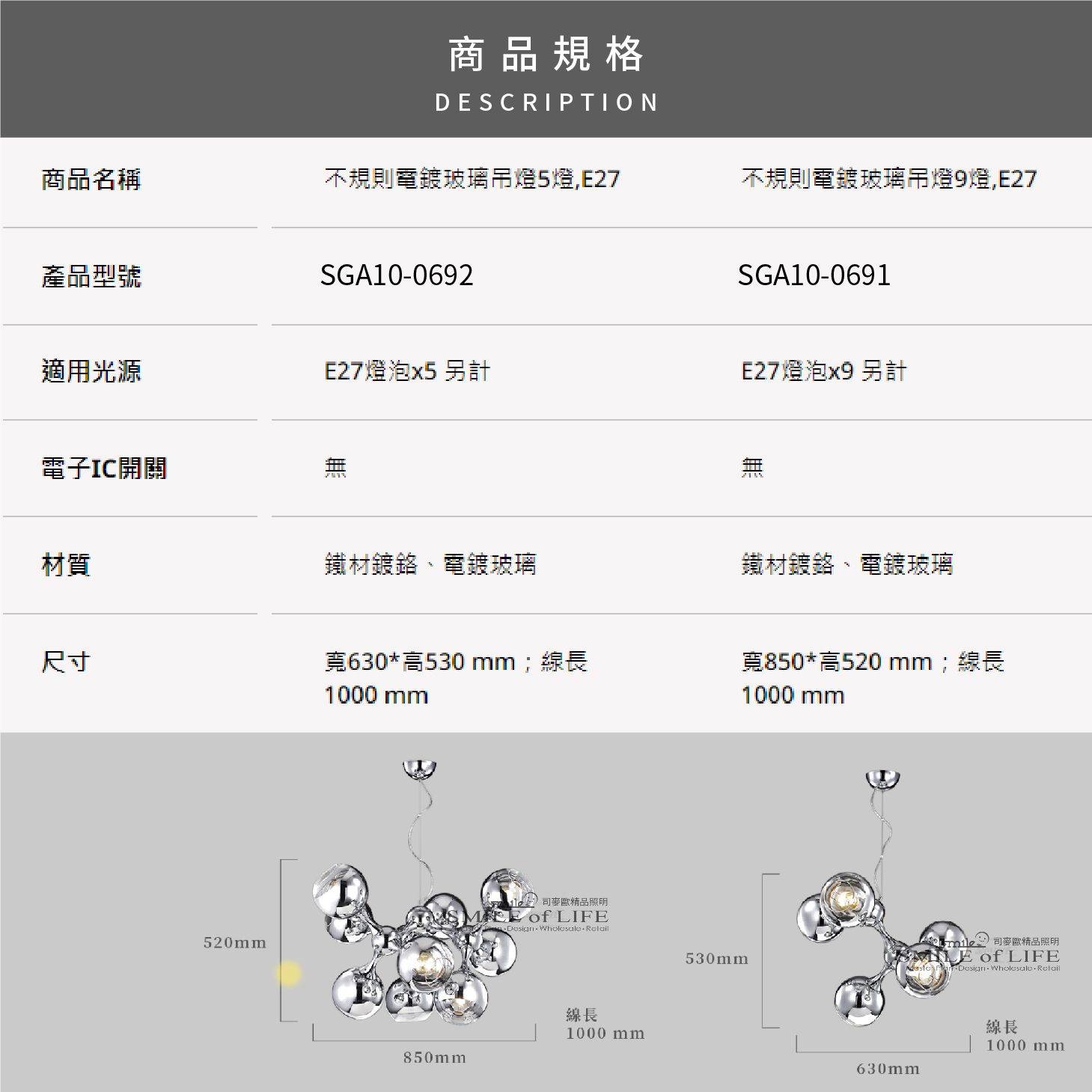 不規則電鍍玻璃吊燈 採用時尚前衛的設計,燈光柔和而溫馨 為用餐空間增添了一絲奢華氛圍 是您家居裝飾的完美選擇! 商品規格: 型號:SGA10-0692 適用光源:E27燈泡x5另計 材質:鐵材鍍古銅、電玻璃 尺寸:寬620*高530mm 線長1200mm . 型號:SGA10-0691 適用光源:E27燈泡x9另計 材質:鐵材鍍古銅、電玻璃 尺寸:寬850*高520mm 線長1200mm 📣 此為金色年代燈飾,並以投保1000萬的產品責任險,請安心購買 商品均有開立發票,附購買明細可打統編,購物有保障