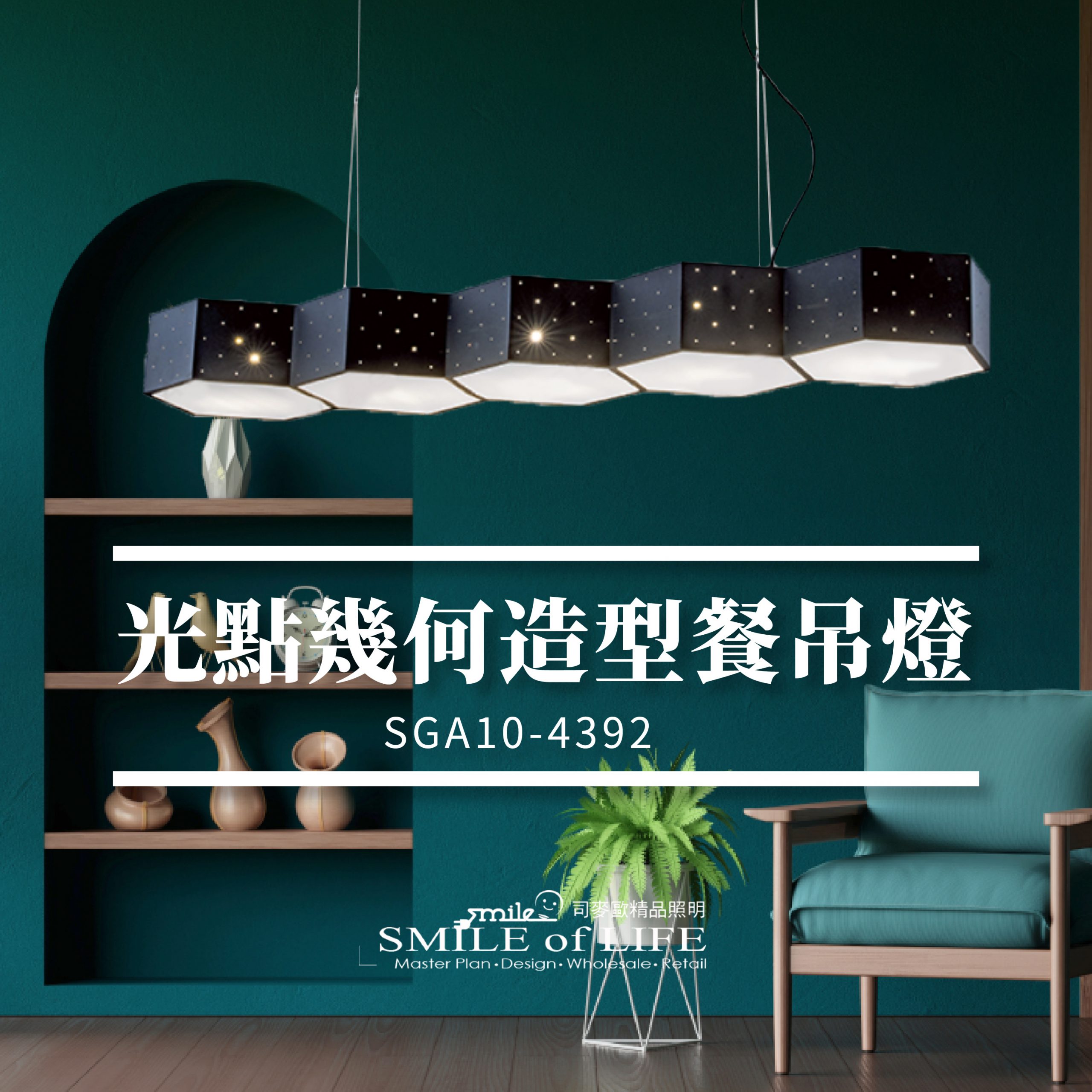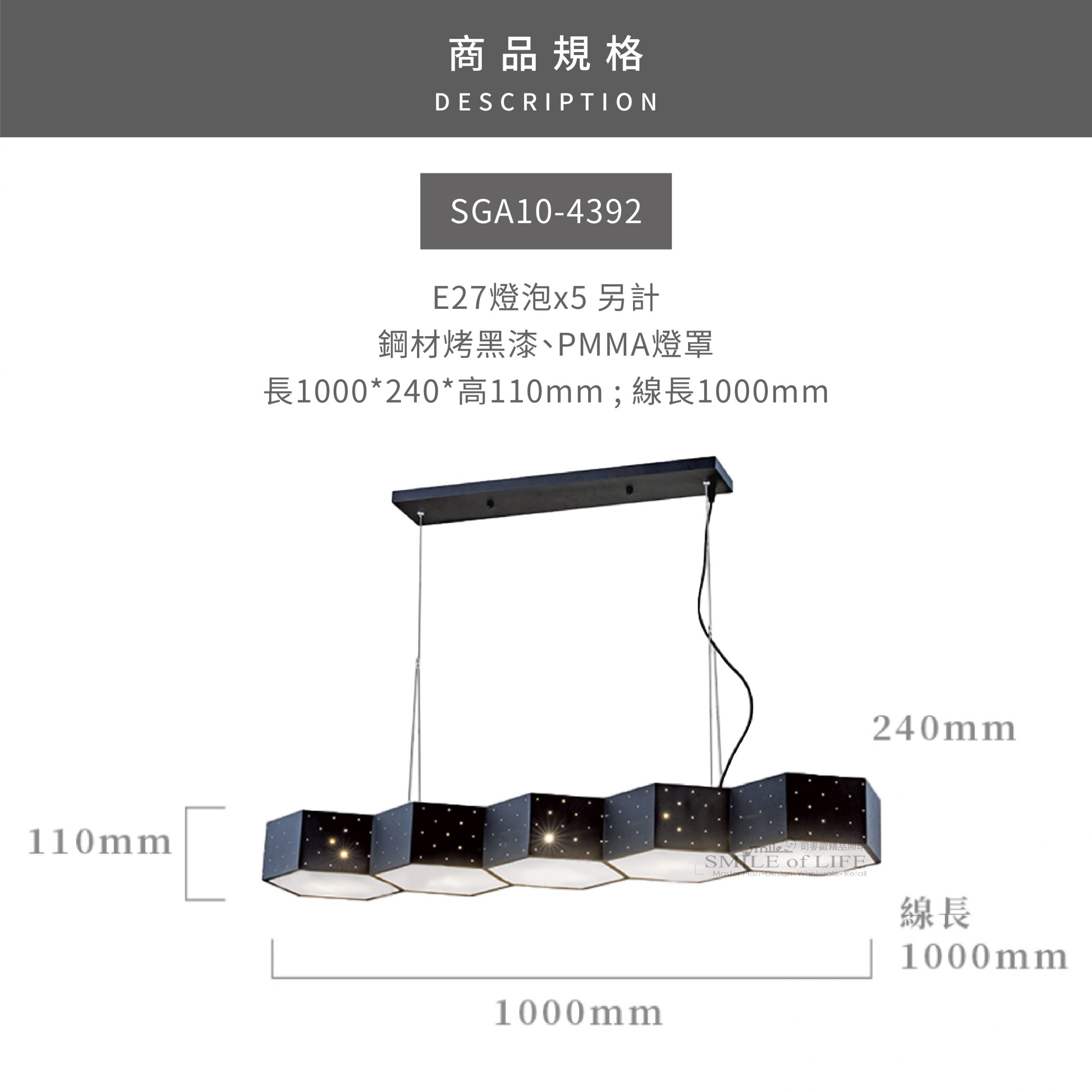 光點幾何造型餐吊燈 光點幾何造型餐吊燈,猶如星空中的璀璨星辰, 點綴著你的用餐空間。簡約而不失設計感的造型, 打破傳統,讓每一頓飯都成為品味的藝術享受 商品規格: / 型號:GA10-4392 適用光源:E27燈泡x5另計 材質:鋼材烤黑漆、PMMA燈罩 尺寸:長1000*240*高110mm ; 線長1000mm 📣 此為金色年代燈飾,原廠保固2年 並以投保1000萬的產品責任險,請安心購買 - 💡 台灣實體店家,舞光授權經銷商,原廠保固兩年 💡 商品均有開立發票,附收據可打統編,安心購物有保障