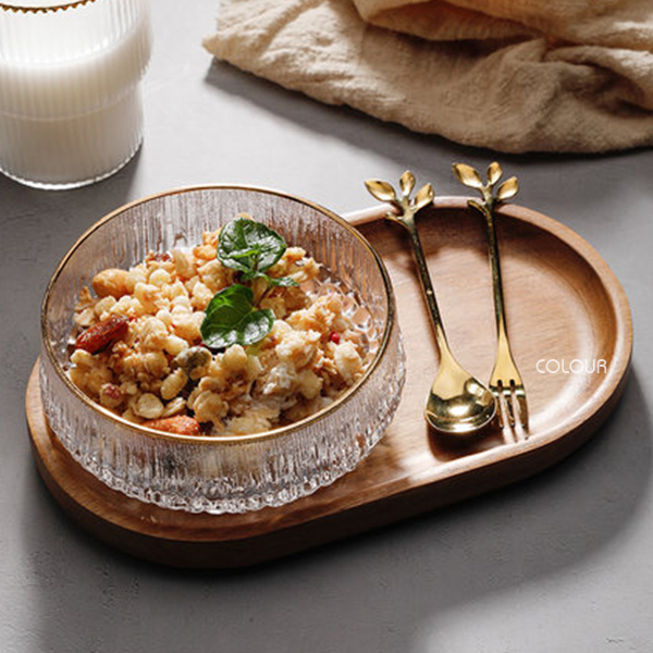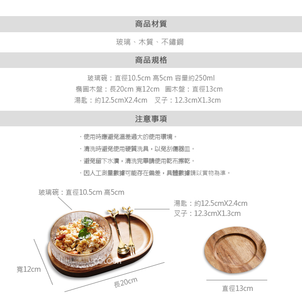 商品規格: 玻璃碗:直徑10.5cm 高5cm 容量約250ml 橢圓木盤:長20cm 寬12cm / 圓木盤:直徑13cm 湯匙:約12.5cmX2.4cm / 叉子:12.3cmX1.3cm