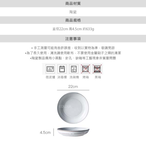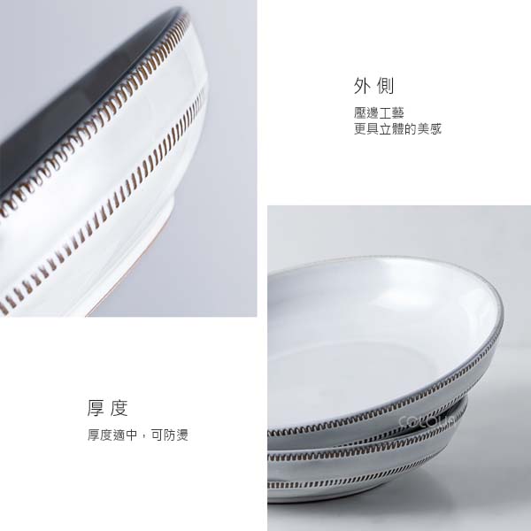 刻紋白色湯盆【22CM】 本系列餐具有復古的耐久美 無論與日式料理搭配還是用作偏西式的擺設 都是餐桌上很吸睛的存在 上新的這款淺口湯盆,質樸耐看 搭配大系列一起使用 能讓你在家就體驗到餐桌美食的風情與儀式感 此尺寸為餐前的濃湯承裝最適宜, 恰好的深度,也可用來作為輕食沙拉等器皿, 用講究的居家器皿,畫出對美好生活的想像與藍圖, 感受流轉於起居空間中的每一吋柔美氛圍,展現主人的生活態度與質感風格, 為恬適的日常寫下完美序言。 商品規格: 直徑22cm 高4.5cm 約633g