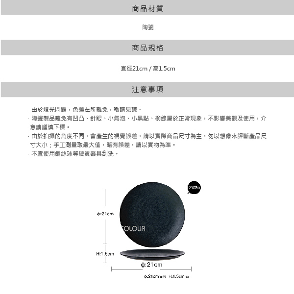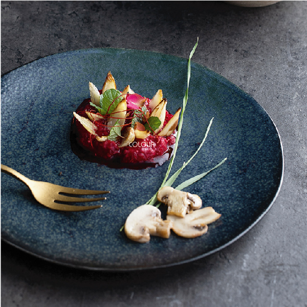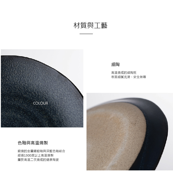 創意仿古藍小盤21cm 金屬鐵粉釉調和深藍色釉 匠人反覆多次,才確認色釉的調配比例 令器具呈現疏密錯落的骨感釉點 經過1300度以上的高溫燒製 屬於高溫二次燒成的健康陶瓷 高溫燒成的戲陶胚 表面細膩光滑、安全無毒 小盤拿在手中 會經驗盤深的纖薄 給人輕盈感 仿古得色釉 顯盡古色、古感與古樸不乏細膩的情懷 商品尺寸: 直徑21cm / 高1.5cm
