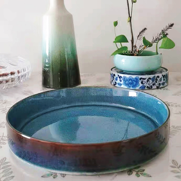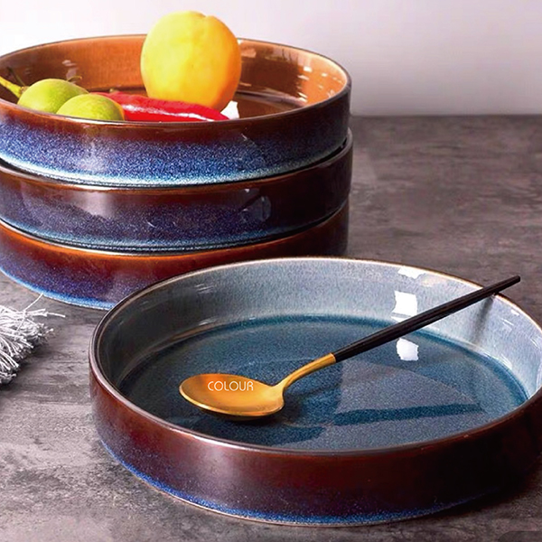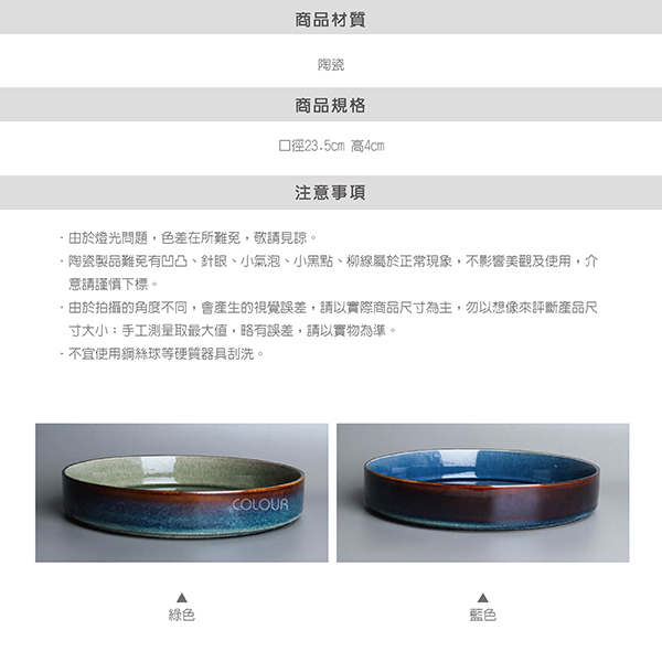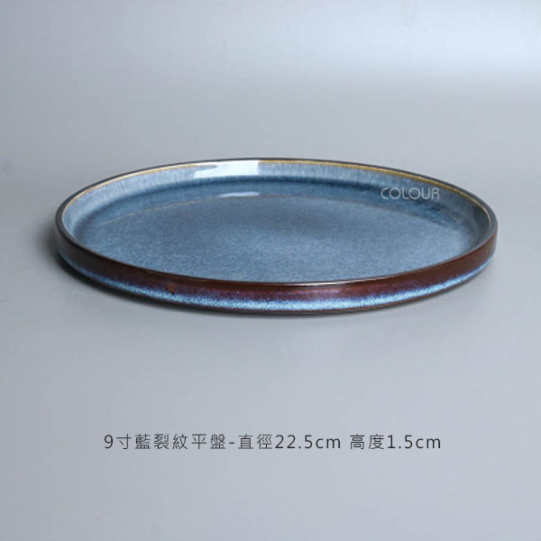 冰裂釉陶瓷圓盤9寸平盤/9.3寸深盤 雙色復古窯變釉工藝 底部為磨砂無釉 易端隔熱不燙手 窯變釉是不可控制的 釉色在窯內生成 燒製過程中為溫差以及上釉的多少都會對成色產生影響 色釉深淺都會不同 因此每一件產品都是不同的 均為正常現象 商品尺寸: 9.3寸 - 口徑23.5cm 高4cm 9寸 - 口徑22.5cm 高1.5cm