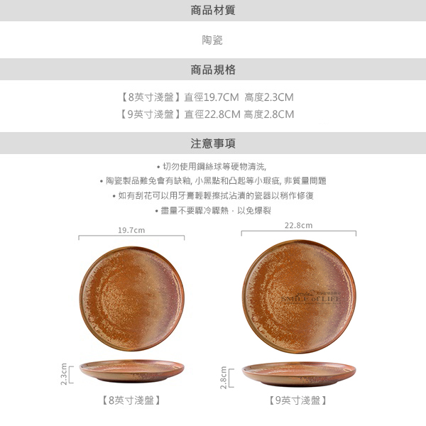 北歐窯變陶瓷菜盤子 北歐簡約的格調 回歸本真自我的純淨魅力 窯變陶瓷體驗手感時光痕跡 貼近樸實卻又不失明朗的生活 # 燒製釉面和器型會因每次製作稍有不同 尺寸會有些許誤差,均屬正常情況 商品規格: 【8英寸淺盤】直徑19.7CM 高度2.3CM 【9英寸淺盤】直徑22.8CM 高度2.8CM