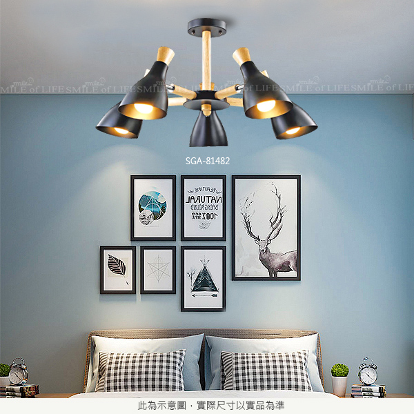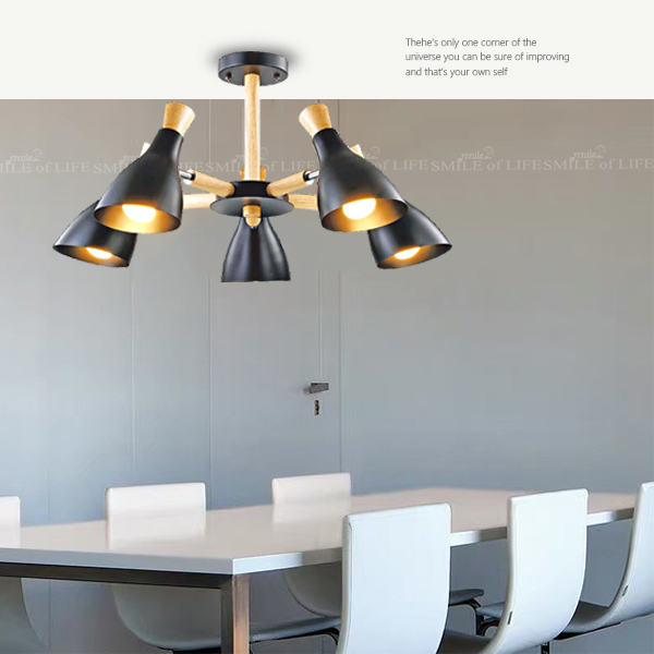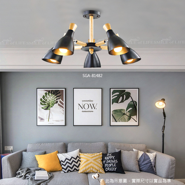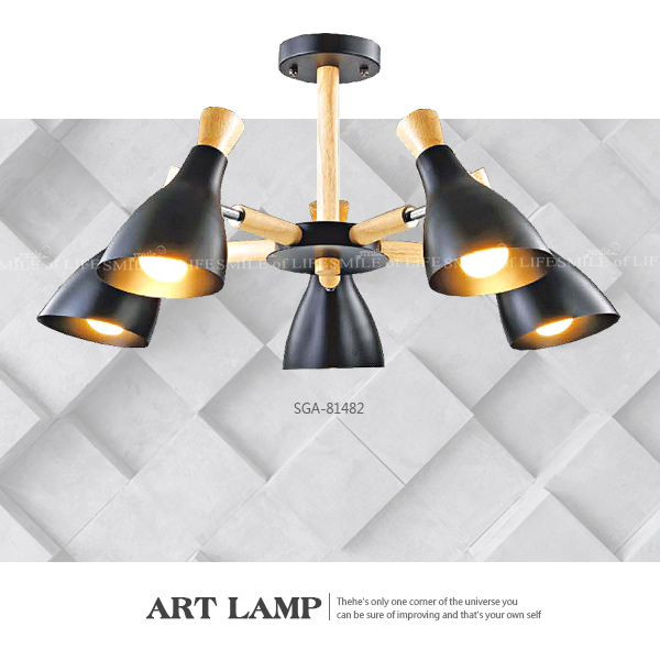 北歐簡黑橡木時尚吸頂吊燈 SGA-81482 產品編號: SGA-81482 尺寸: W650mm H360mm 光源: E27x5 另計 內附: 電子開關 材質: 鋼質烤漆、橡木 (燈罩角度可以調整) (中心可另加長鐵管250mm) ※安裝過後恕不退換/偏遠地區郵資另計※