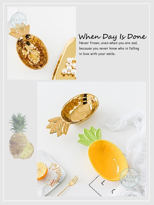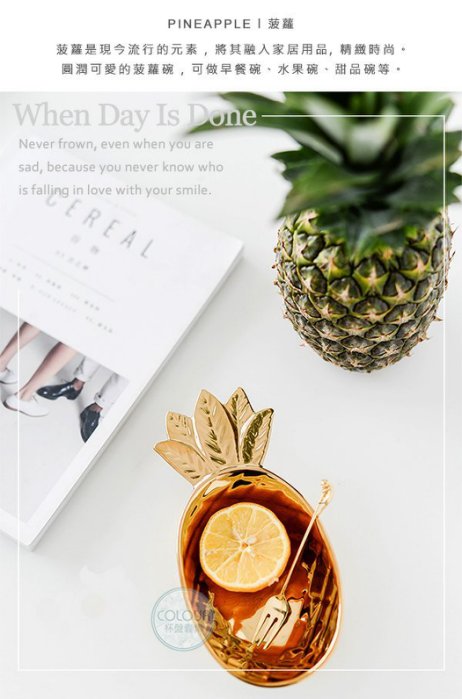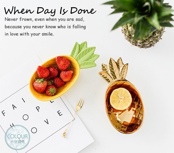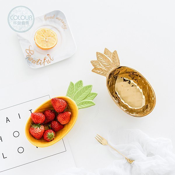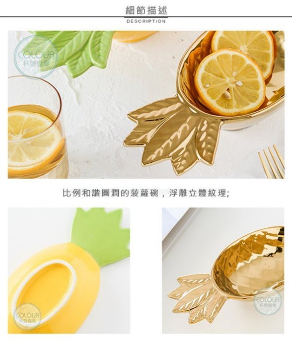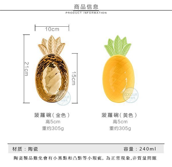 菠蘿造型鍍金陶瓷碗 圓潤可愛的菠蘿碗 可做早餐碗、水果碗、甜品等。 【商品尺寸】 尺寸 : 總長21CM 寬10CM 高5CM 重量 : 約305g 材質 : 陶瓷 容量 : 約305g ※陶瓷製品難免會有小黑點和凸點燈小瑕疵,為正常現象,非品質問題
