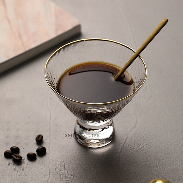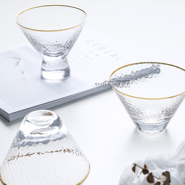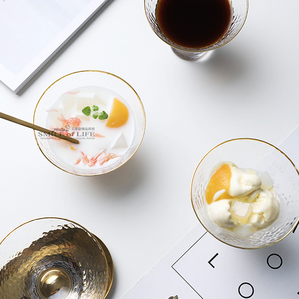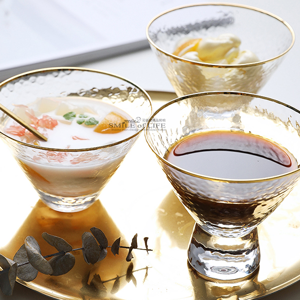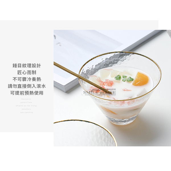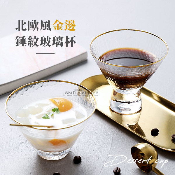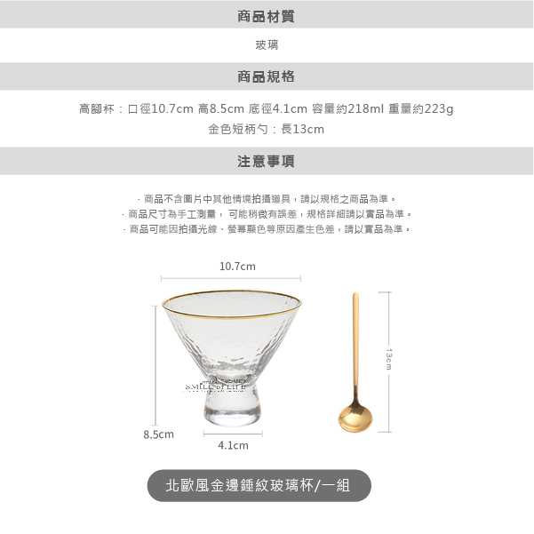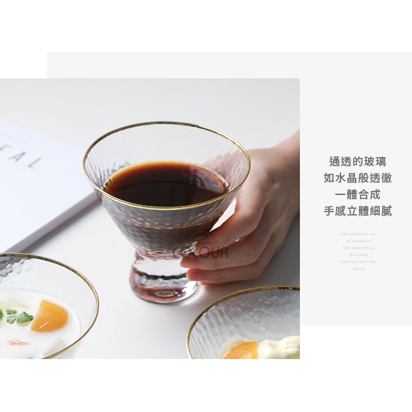 描金邊錘紋玻璃杯 錘目紋理搭配金邊,高雅精細 玻璃通透勻淨,讓甜品看起來更美味 趕緊幫自己營造一個優雅浪漫的午後時光吧 商品尺寸: 金色短柄勺 · 長13cm 高腳杯 · 口徑10.7cm 高8.5cm 底徑4.1cm 容量約218ml