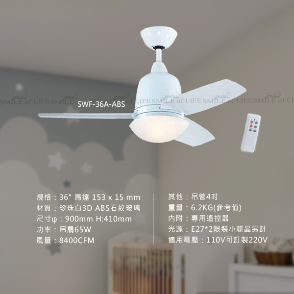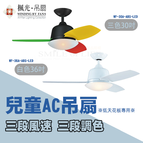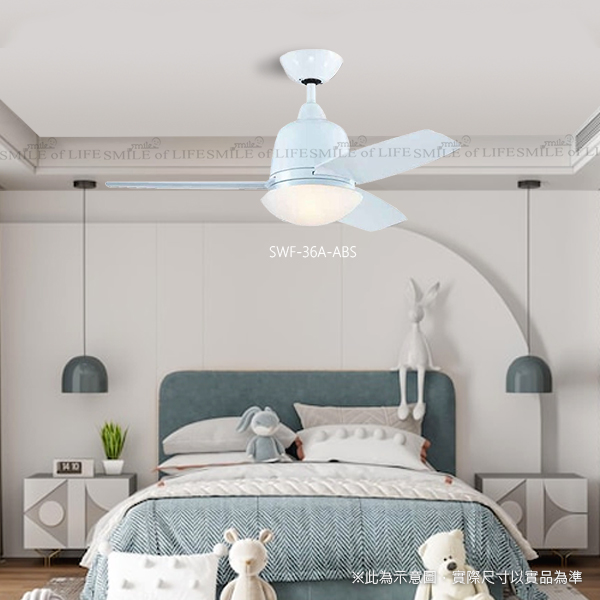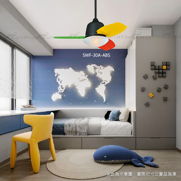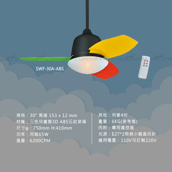 兒童AC吊扇燈 30吋/36吋 有簡約白和三色活力彩色兩款 兒童空間變得舒適又美觀 讓孩子在快樂的環境成長 商品規格: 型號:SWF-36A-ABS 規格:36" 馬達 153 x 15 mm 材質:珍珠白3D ABS石紋玻璃 尺寸φ:900mm H:410mm 功率:吊扇65W 風量:8400CFM 其他:吊管4吋 重量:6.2KG(參考值) 內附:專用遙控器 光源:E27*2限裝小麗晶另計 適用電壓:110V可訂製220V 型號:SWF-30A-ABS 規格:30" 馬達 153 x 12 mm 材質:三色兒童扇3D ABS石紋玻璃 尺寸φ:750mm H:410mm 功率:吊扇65W 風量:6200CFM 其他:吊管4吋 重量:6KG(參考值) 內附:專用遙控器 光源:E27*2限裝小麗晶另計 適用電壓:110V可訂製220V