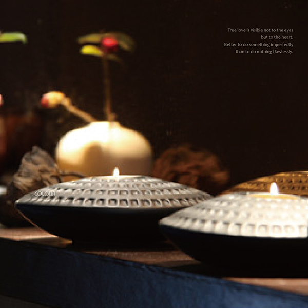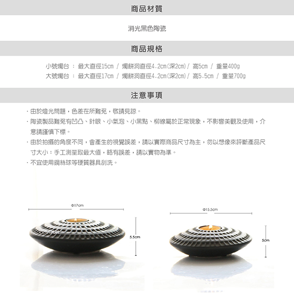千佛舍燭台擺件【大/小款】 取形魚千佛洞舍等壯觀佛門景象 造型簡潔更富內涵 燭光微微 佛光普照光宇 極易營造空靈飄逸的靜心環境 商品尺寸: 大號燭台 : 最大直徑17cm / 燭餅洞直徑4.2cm(深2cm)/ 高5.5cm / 重量700g 小號燭台 : 最大直徑15cm / 燭餅洞直徑4.2cm(深2cm)/ 高5cm / 重量400g