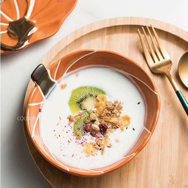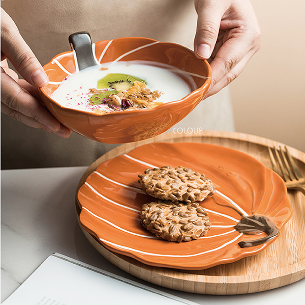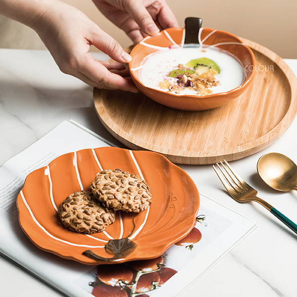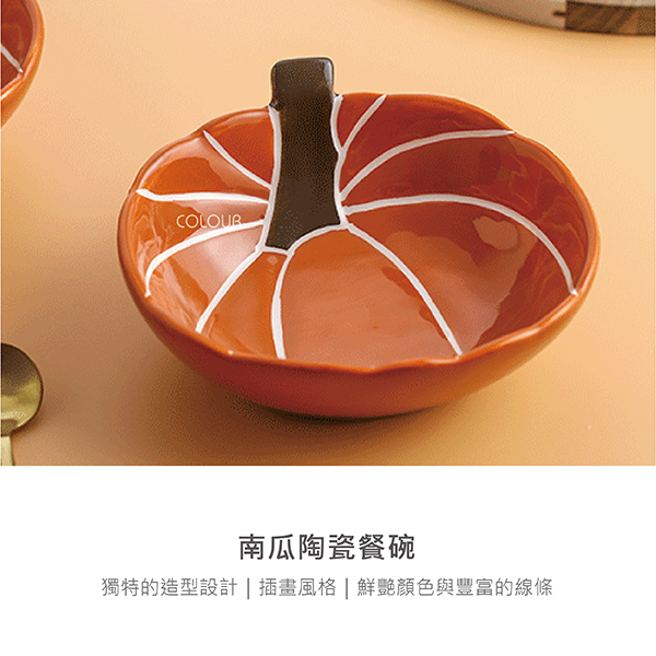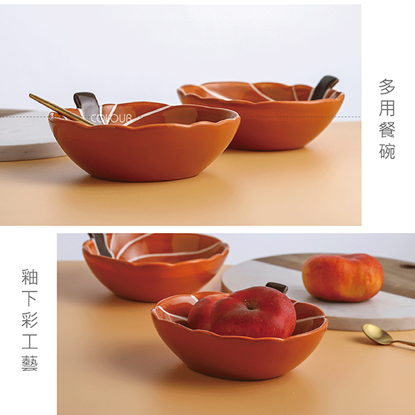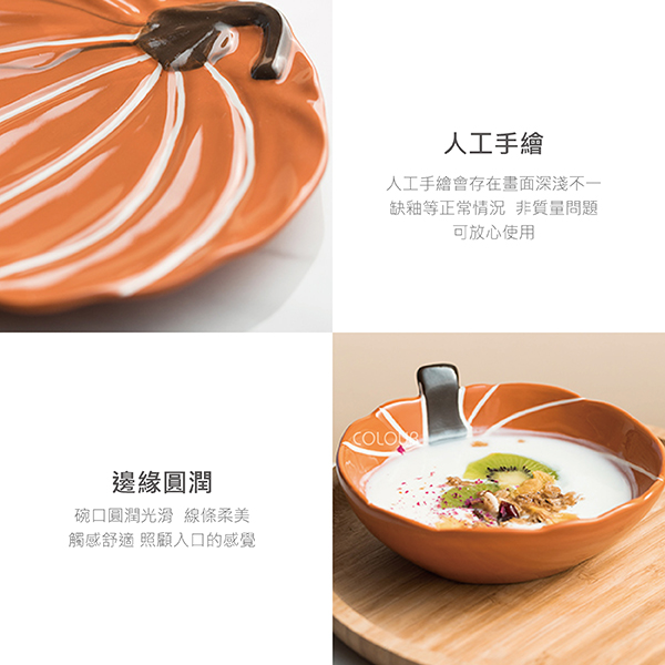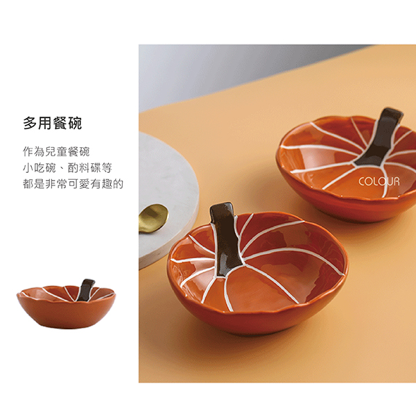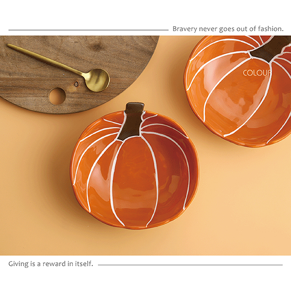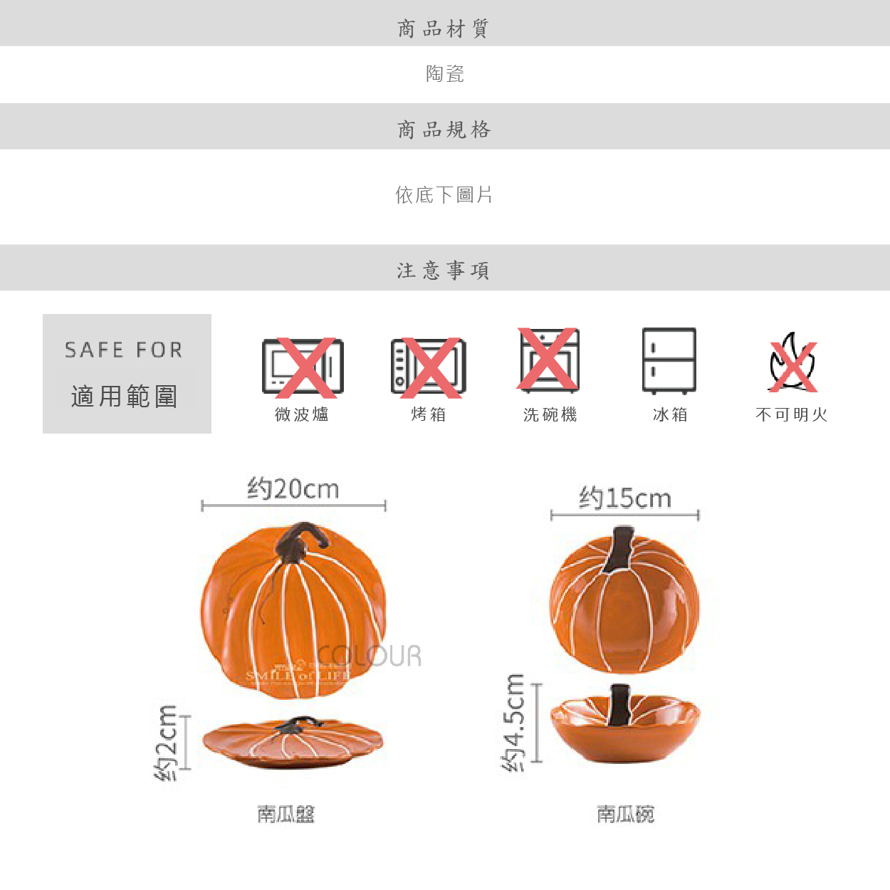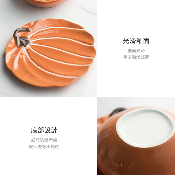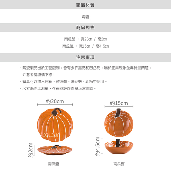 南瓜形個性創意陶瓷碗/盤 釉下彩工藝/安全健康/不易退色 環保釉面隔層將色彩牢牢包裹,健康不掉色。 插畫造型卡通可愛 圓潤可愛,可做餐具或小吃碗,百搭多用。 獨特的造型設計,插畫風格,鮮豔的色彩和豐富的線條 陶瓷質地配上南瓜色彩,造型形象逼真。 邊緣設計 邊緣光滑圓潤,瓷質細膩,觸感溫潤,厚實防燙。 底部設計 出於防滑和實際操作考慮,杯底不上釉,已打磨光滑,不傷桌面。 【商品尺寸】 南瓜盤 : 寬20cm / 高2cm 南瓜碗 : 寬15cm / 高4.5cm