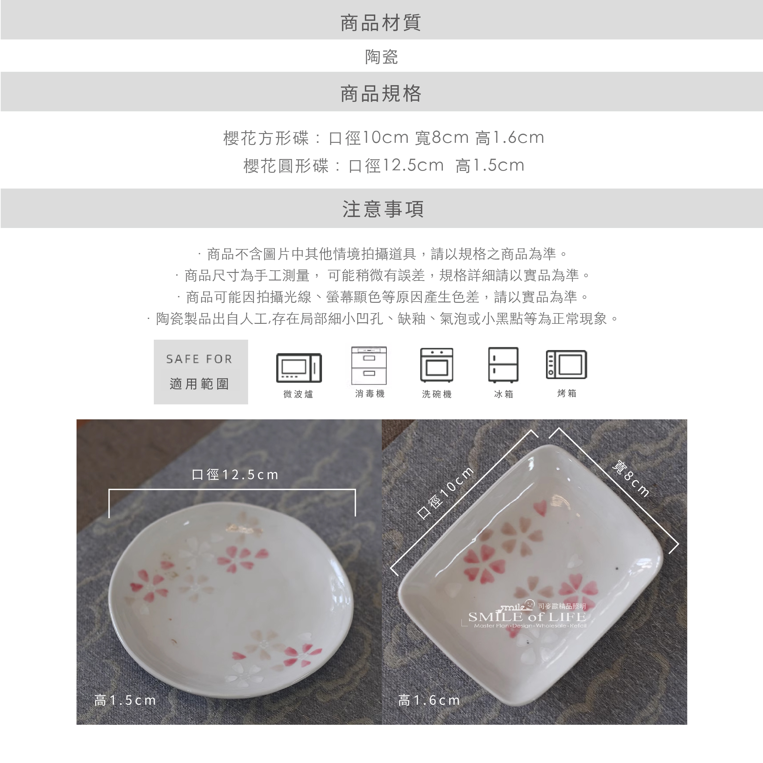 和風櫻花手繪陶瓷碟 感受櫻花紛飛的浪漫,為您的餐桌增添一抹日式風情。 - 精湛的手繪技藝描繪出優雅的櫻花圖案, 象徵著春日的美好與希望,展現出獨特的藝術韻味 釉下彩工藝使得圖案色彩鮮豔且經久耐用。 商品尺寸 圓形:直徑12.5cm 高1.5cm 方形:直徑10cm 寬8cm 高1.5cm