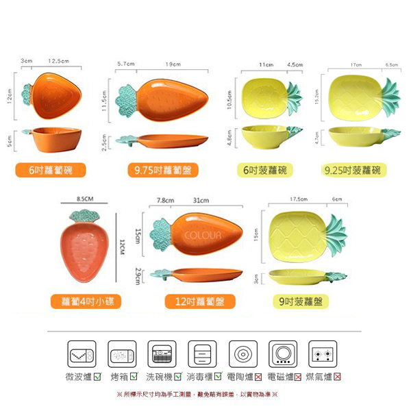 12吋蘿蔔盤, 6吋菠蘿碗, 6吋蘿蔔碗, 9.25吋菠蘿(鳳梨)碗, 9.75吋蘿蔔盤, 9吋菠蘿盤, 蘿蔔4吋小碟
