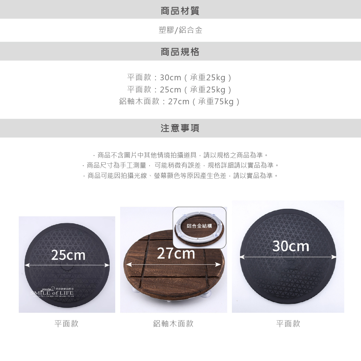多用途轉盤底座 / 360度耐磨耐重 轉盤使用鋼硃網結構 旋轉台平穩不易脫落 商品尺寸: 鋁軸木面款(背面滑軌鋁合金):27cm 平面款(背後一般滑面):25cm、30cm