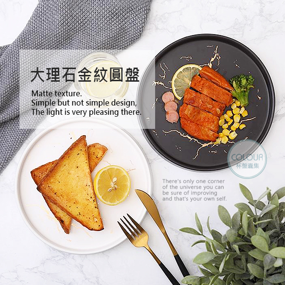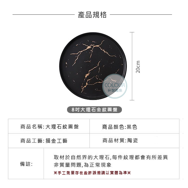 大理石金紋圓盤【黑色8吋】 大理石紋路每年都很夯 素雅大方別具一格 搭配精美的描金大理石紋 將其應用在餐具上 彷若渾然天成 【商品尺寸】8吋-直徑20cm