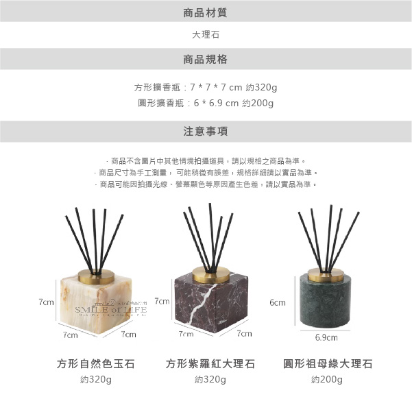 天然大理石香薰瓶 『贈擴香棒*5根』 精選天然大理石材質 細直打磨拋光,匠心工藝 簡約大氣風格,打造滿滿生活儀式感 商品尺寸: 方形擴香瓶:7*7*7cm 約320g 圓形擴香瓶:6*6.9cm 約200g