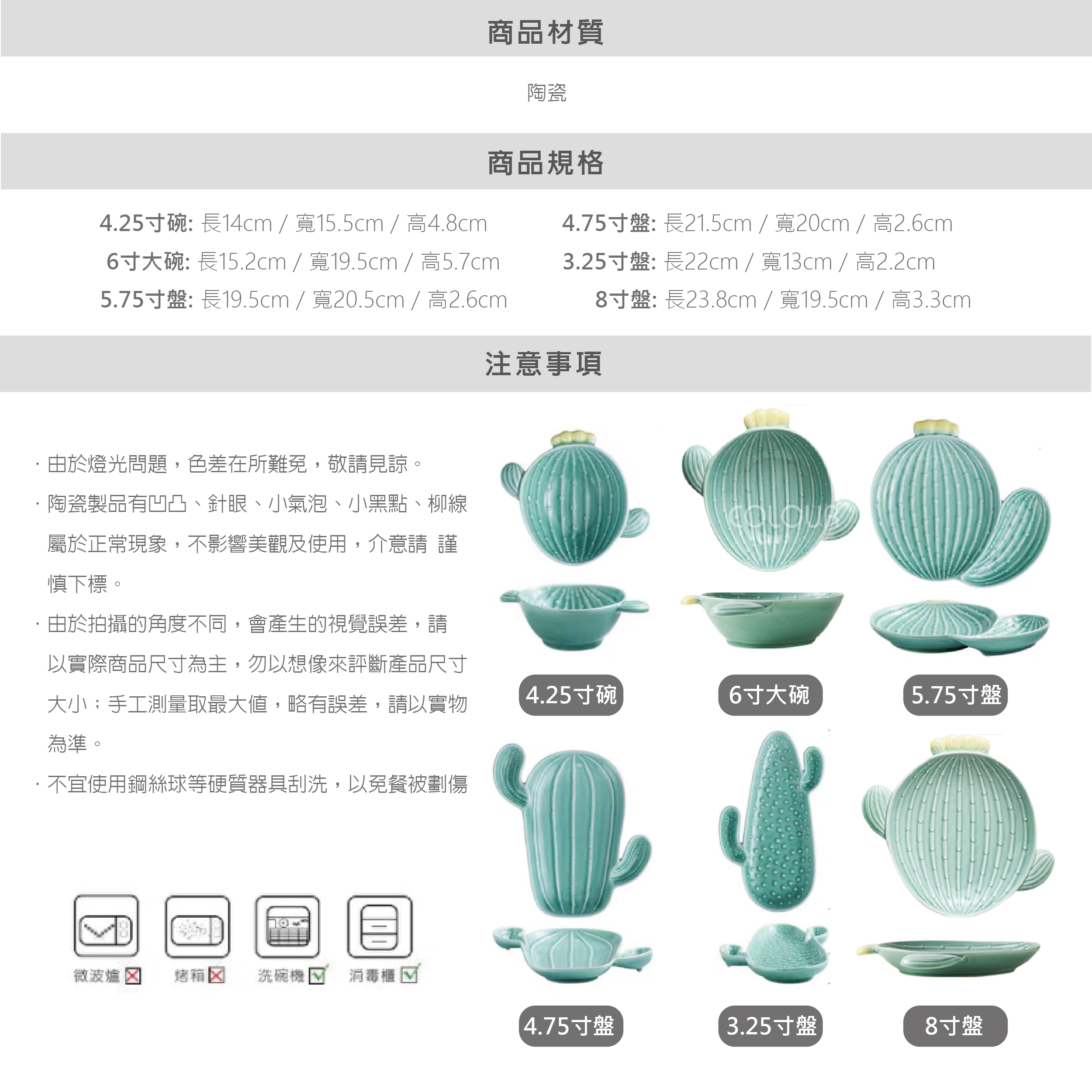 小清新仙人掌陶瓷碗盤盤 可愛仙人掌造型栩栩如生 層次感的浮雕設計 邊緣圓潤 帶著生動自然氣息 用餐之餘增添幾分樂趣 讓人愛不釋手 美好的瓷器總能給我們生活帶來美妙 享受美食的同時感受著餐具帶來的視覺感受 【商品尺寸】請依圖上標示為主