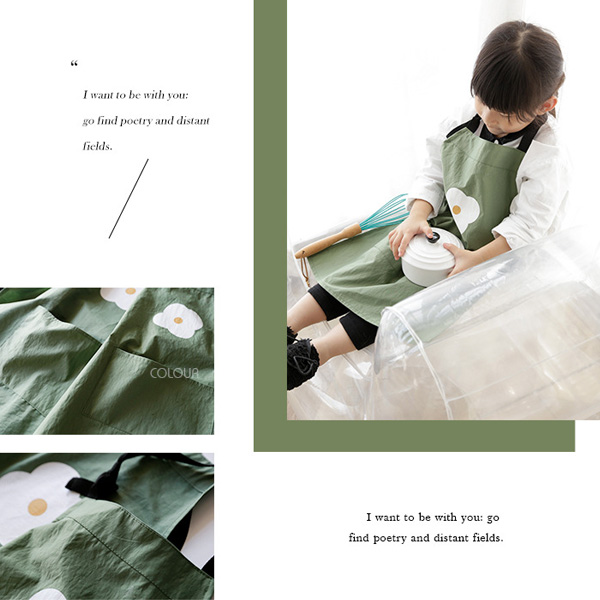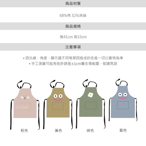 小清新卡通親子圍裙 廚房裡有件可愛圍裙 讓親子一起做菜過程大大加分 四個款式實在都太可愛啦! 增加溫馨的家庭氛圍 防水防油材質 保護衣服不被弄髒 清洗簡單容易 商品尺寸: 寬41cm 高53cm