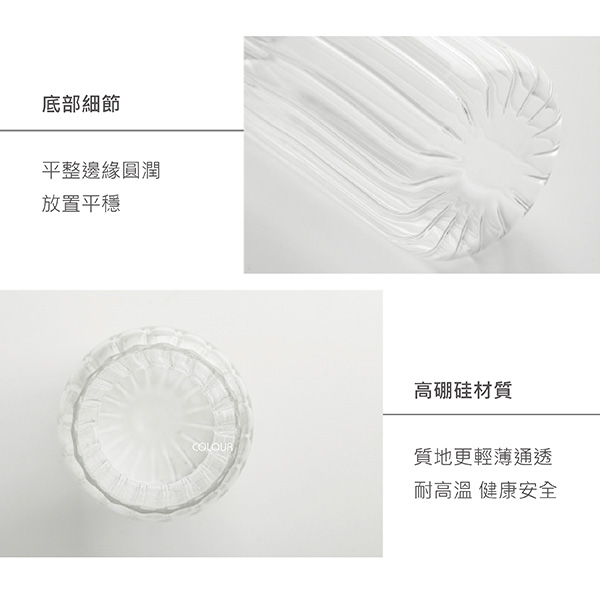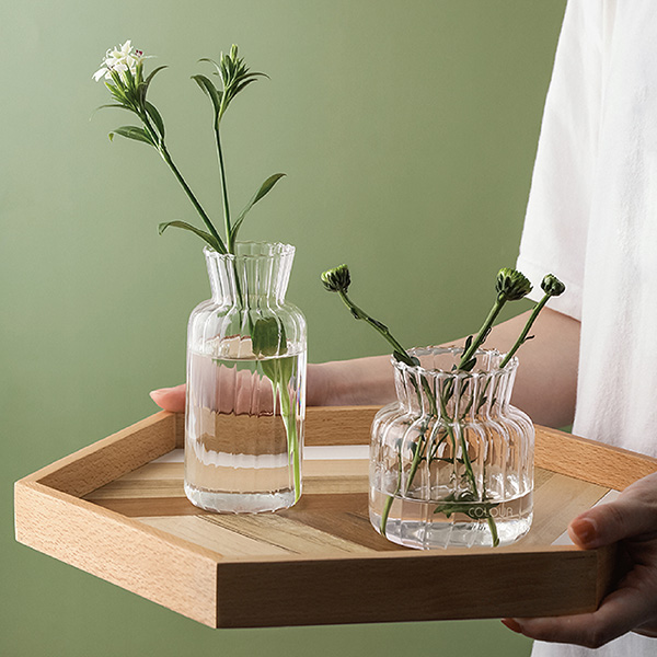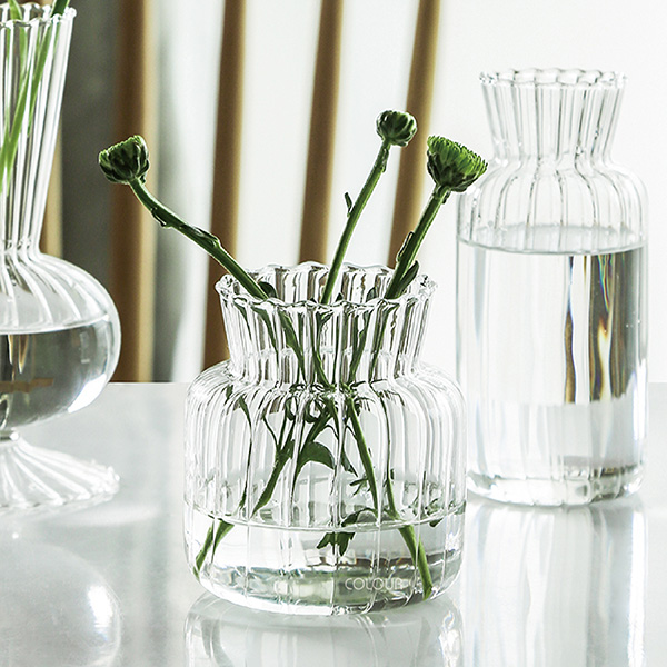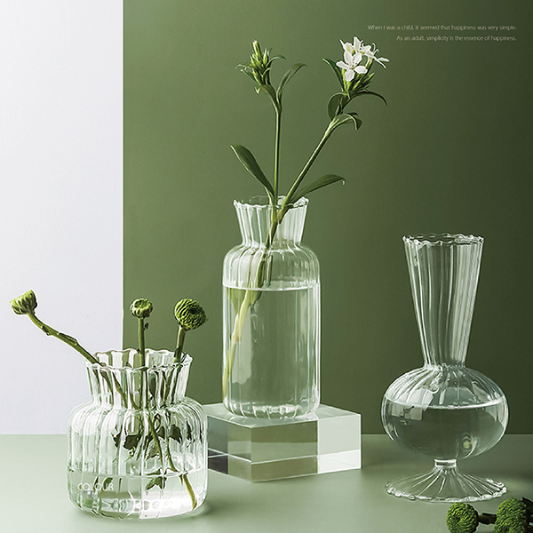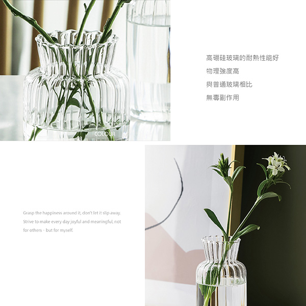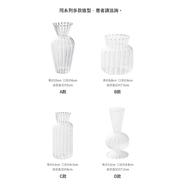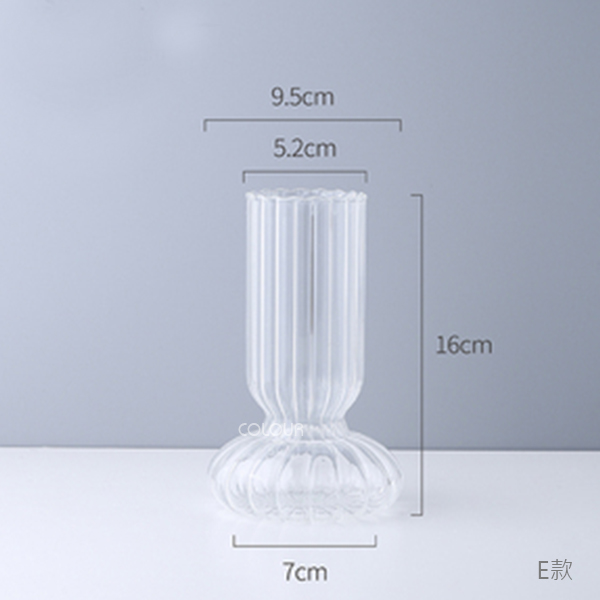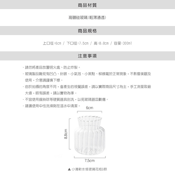 小清新水培玻璃花瓶B/C/E款 此款迷你水培花瓶採用高硼硅玻璃人工吹製而成 質地輕薄小巧,瓶身比普通玻璃更通透晶瑩 花邊瓶口 條文瓶身 精緻耐看 夏日裡在床頭放上一兩隻花葉 就十分愜意了 商品尺寸 B款-上口徑6cm / 下口徑7.5cm / 高8.8cm C款-上口徑4.5cm / 下口徑6cm / 高13cm E款-上口徑5.2cm / 下口徑7cm / 高16cm