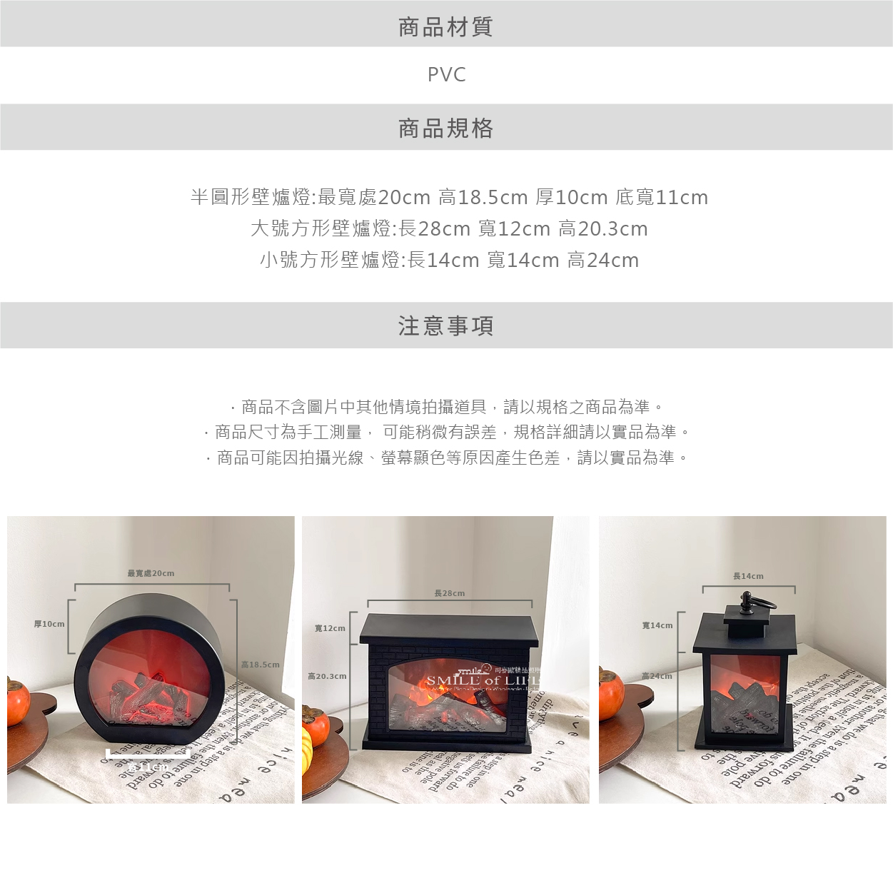 復古仿真壁爐氛圍燈 融合了復古風情和現代科技 透過逼真的火焰效果和柔和的燈光 營造出溫馨浪漫的氛圍 讓您在家中也能感受到壁爐的溫暖舒適氛圍 商品尺寸: 大方形:長28cm 寬12cm 高20.3cm 小方形:長14cm 寬14cm 高24cm 半圓形:最寬處20cm 高18.5cm 底寬11cm