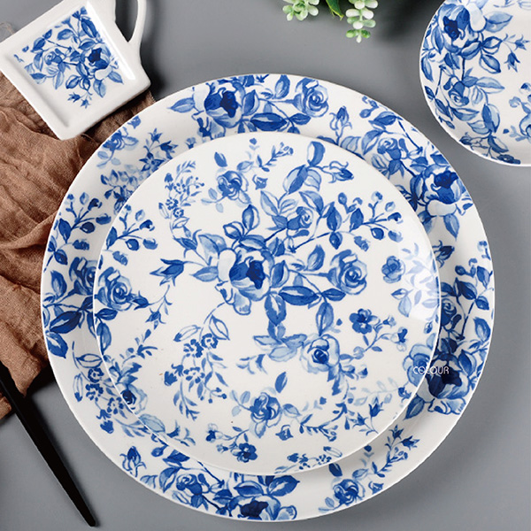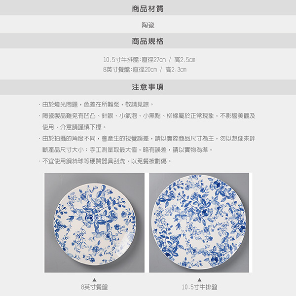 【微瑕】英式青花陶瓷盤 簡約 時尚 瓷器光潔如玉 典雅青花系 不失時尚田園風格 釉面光滑耐磨 瓷質始終如新 表面易清潔不黏釉 商品尺寸 10.5寸牛排盤:直徑27cm / 高2.5cm 8英寸餐盤:直徑20cm / 高2.3cm