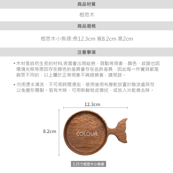相思木小魚碟3.25寸 簡單質樸的生活中尋找快樂 手工匠做紋理清晰 整木一體成型手工打磨光滑 每一個細節處都盡善盡美 表面觸感細膩。 魚尾設計鮮活靈動,造型豐富更易端拿 不燙手不打滑 可做小菜碟、甜品碟,亦或是擺拍道具 商品尺寸: 長12.3cm 寬8.2cm 高2cm