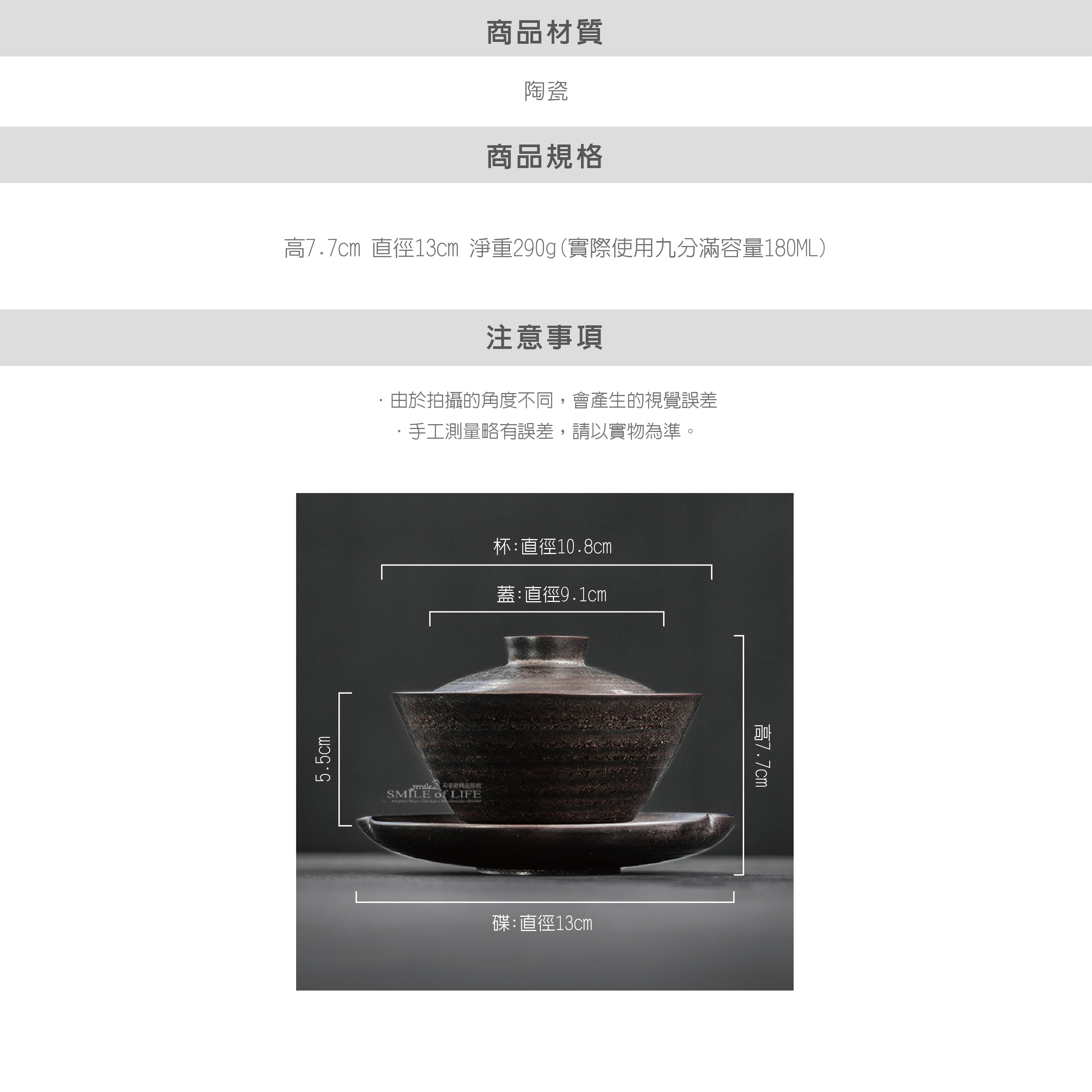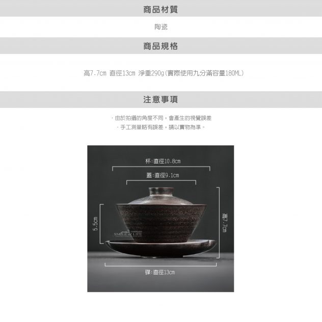 手工薄胎大號三才蓋碗 陶製手作,薄邊設計,易變形率低, 忙碌中的一段休憩來杯茶, 舒身宜人爽心、禪意雅致。 商品規格: 蓋 高2.5cm 直徑9.1cm 杯 高5.5cm 直徑10.8cm 碟 高1.8cm 直徑13cm 整體 高7.7cm 直徑13cm淨重290g (實際使用九分滿容量180ML)
