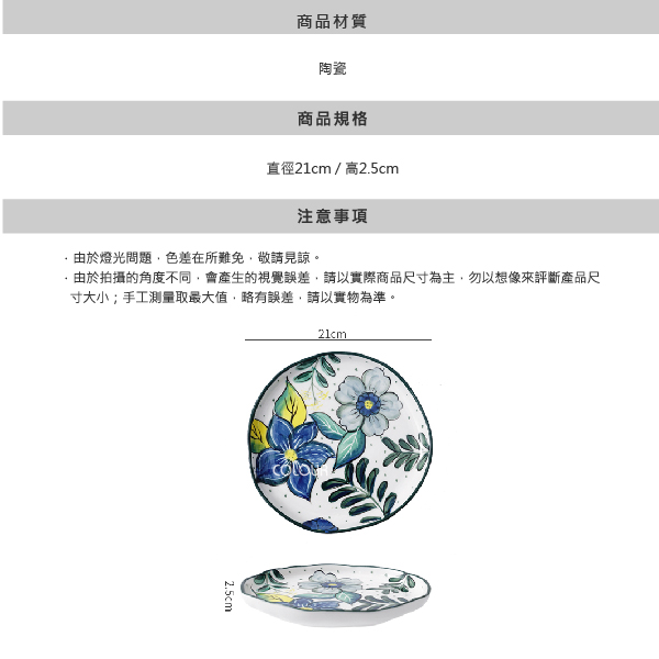 手繪不規則水彩花卉陶瓷盤 手繪花朵餐盤系列, 耐磨,瓷質堅實, 釉面順滑有光澤, 流暢的線條, 美觀的圖案通過瓷器的展現, 將藝術融入人們的日常生活。 商品規格: 直徑21cm 高2.5cm