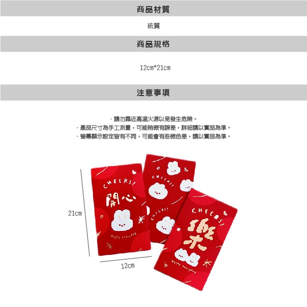 手繪兔特別加大加厚版紅包 搭配細膩的線條和鮮豔的色彩 呈現出活潑可愛的形象 讓您的紅包不再單調,而是充滿生活趣味 - 使用高品質加厚紙張材質,特別加大的尺寸 更容納得下豐厚的祝福, 堅固耐用, 確保您的紅包不易受損,更具質感。 商品尺寸:特厚 12cm*21cm