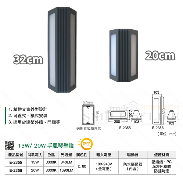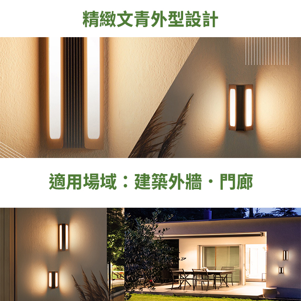 手風琴防水壁燈SE-2355 精緻文青外型設計 有20及32公分尺寸可選擇 兩側散發出的氛圍光影 讓牆面別有一番風味 ✦ IP66防塵防水等級 ✦ 內含防水驅動器 ✦ 可直式、橫式安裝 ✦ 適用於建築外牆、門廊 ✦ 適用直式預埋盒