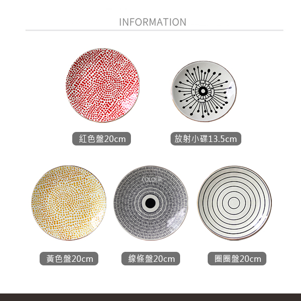 圈圈盤, 放射碟, 紅色盤, 線條盤, 黃色盤