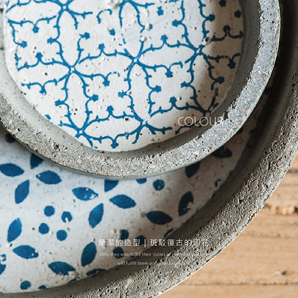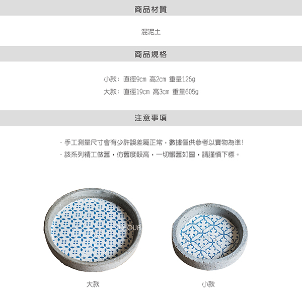 日式仿古印花水泥托盤【大/小款】 ※下單前請先注意尺寸哦※ 第一眼就愛上小花托盤 簡潔的造型、斑駁復古的印花 隨意栽種擺設都美不勝收 一抹日影在高地錯落中 享受著悠閒時光 商品尺寸 大款: 直徑19cm 高3cm 重量605g 小款: 直徑9cm 高2cm 重量126g(小小的適合當杯墊)