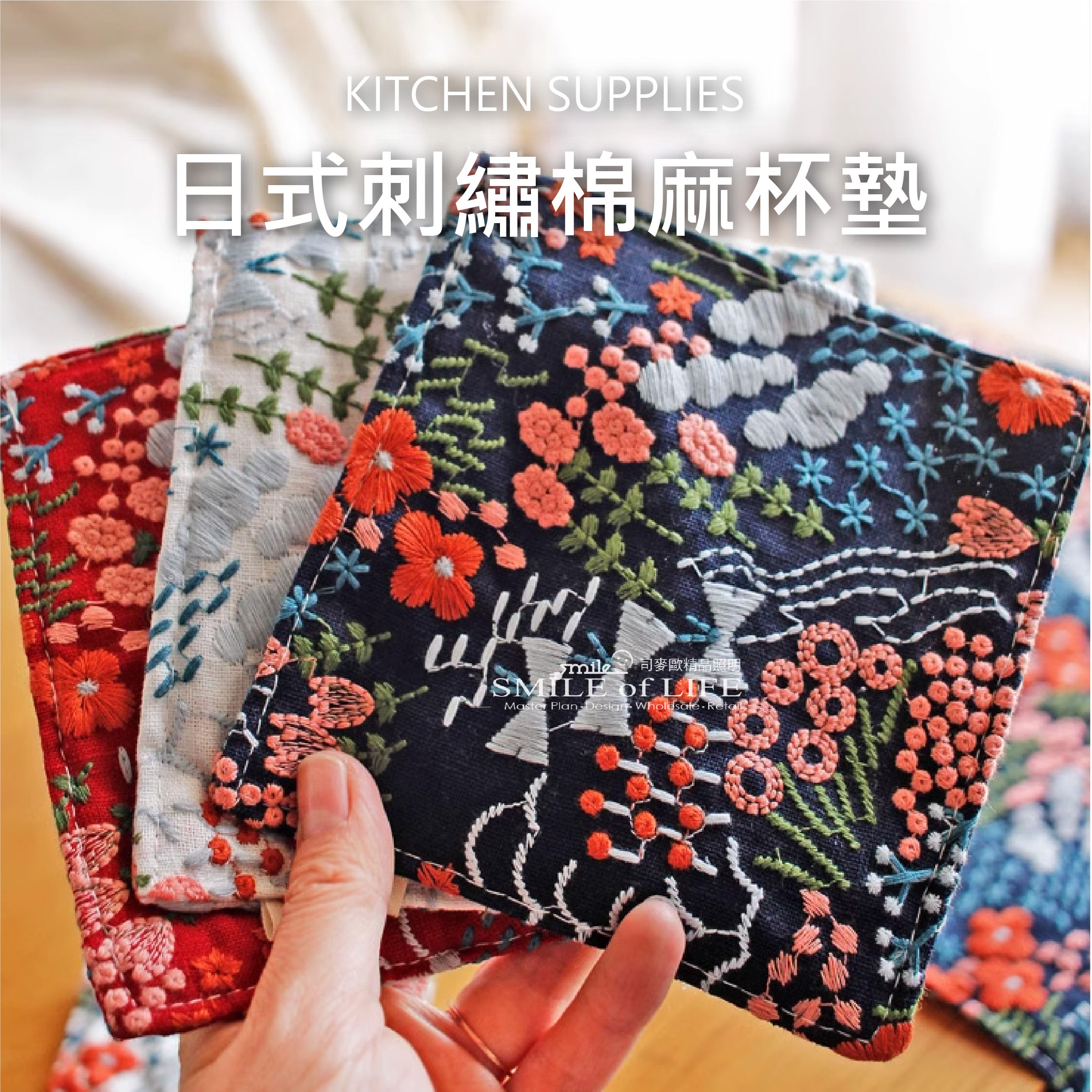 日式刺繡棉麻杯墊 精緻的手工刺繡和天然的棉麻材質,展現出濃厚的日本風格。 搭配柔和的色調,呈現出簡約而溫暖的氛圍。 棉麻的材質不僅耐用且透氣, 能有效保護桌面免受杯子熱氣或水漬的侵襲,實用性與美觀兼具。 商品尺寸:20*30 cm 商品顏色:白色、紅色、藍色